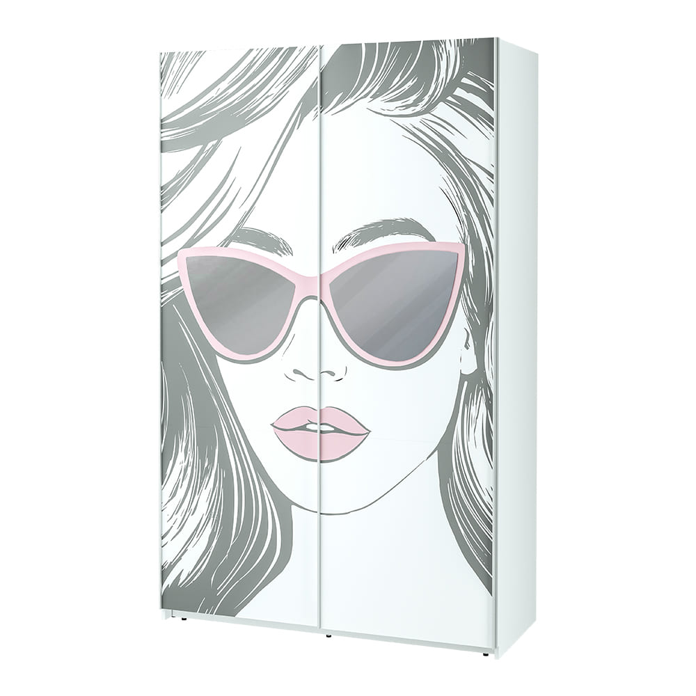 - стильная модель декорирована фотопечатью с изображением лица девушки в очках, стекла которых одновременно служат зеркалом.
