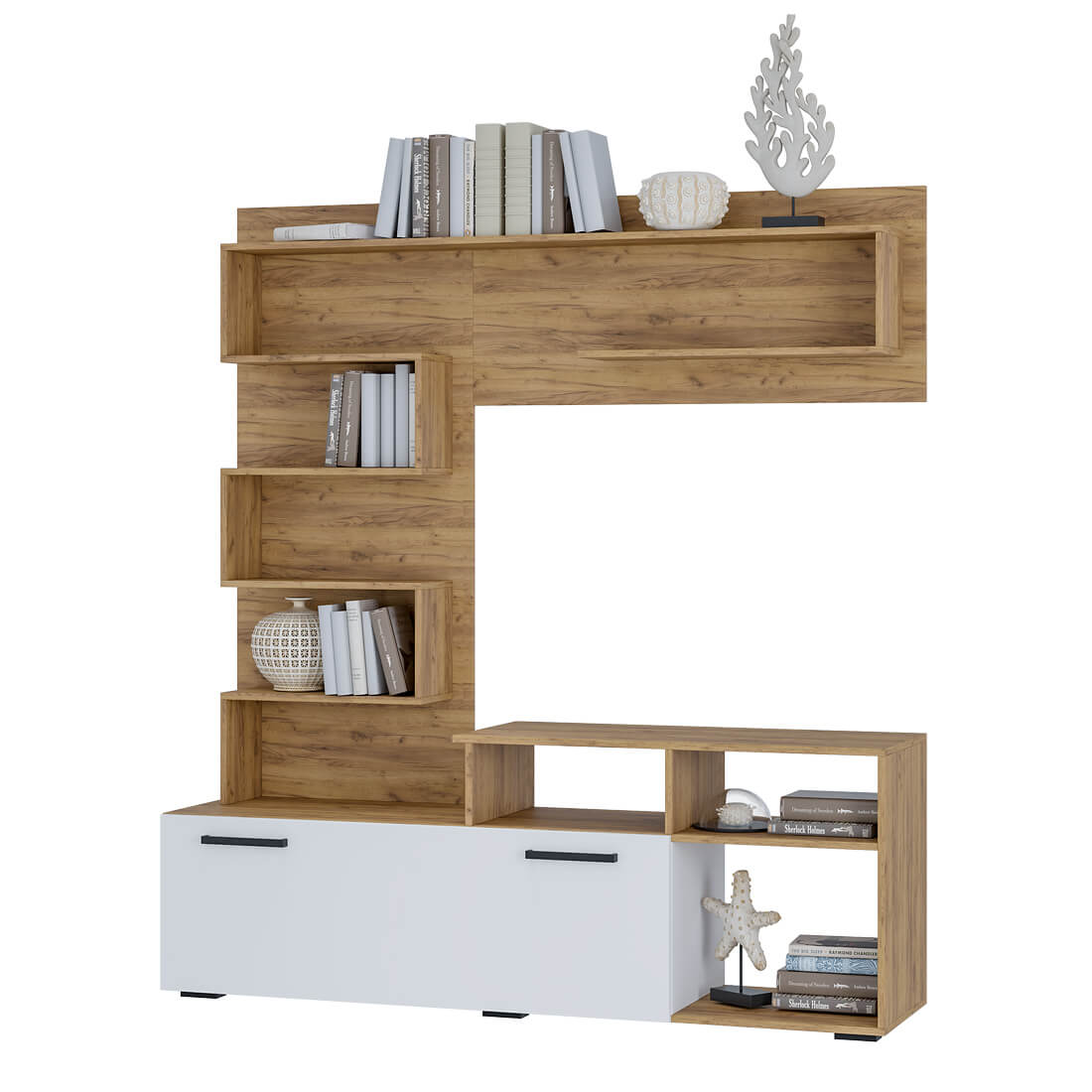 Функциональный и компактный гарнитур Евро прекрасно подойдёт для небольшой гостиной. Модель, ориентированная на удобство и простоту использования. оригинальные открытые полки, на которых можно разместить фотографии, предметы декора или любимые книги, представляют собой единую ломаную линию удобная зона под ТВ вместительная ниша, скрытая створкой в цвете белый.