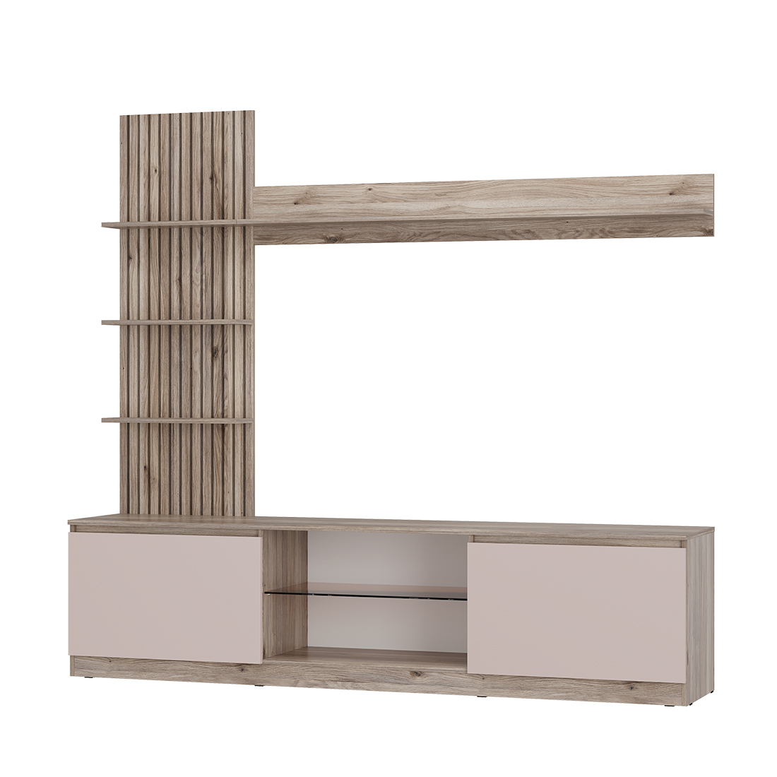 Гостиная "Рио" представляет собой единую конструкцию и вмещает в себя всё необходимое для компактного хранения - вместительная ниша под ТВ, открытые полки для домашней акустики и нужных вещей.