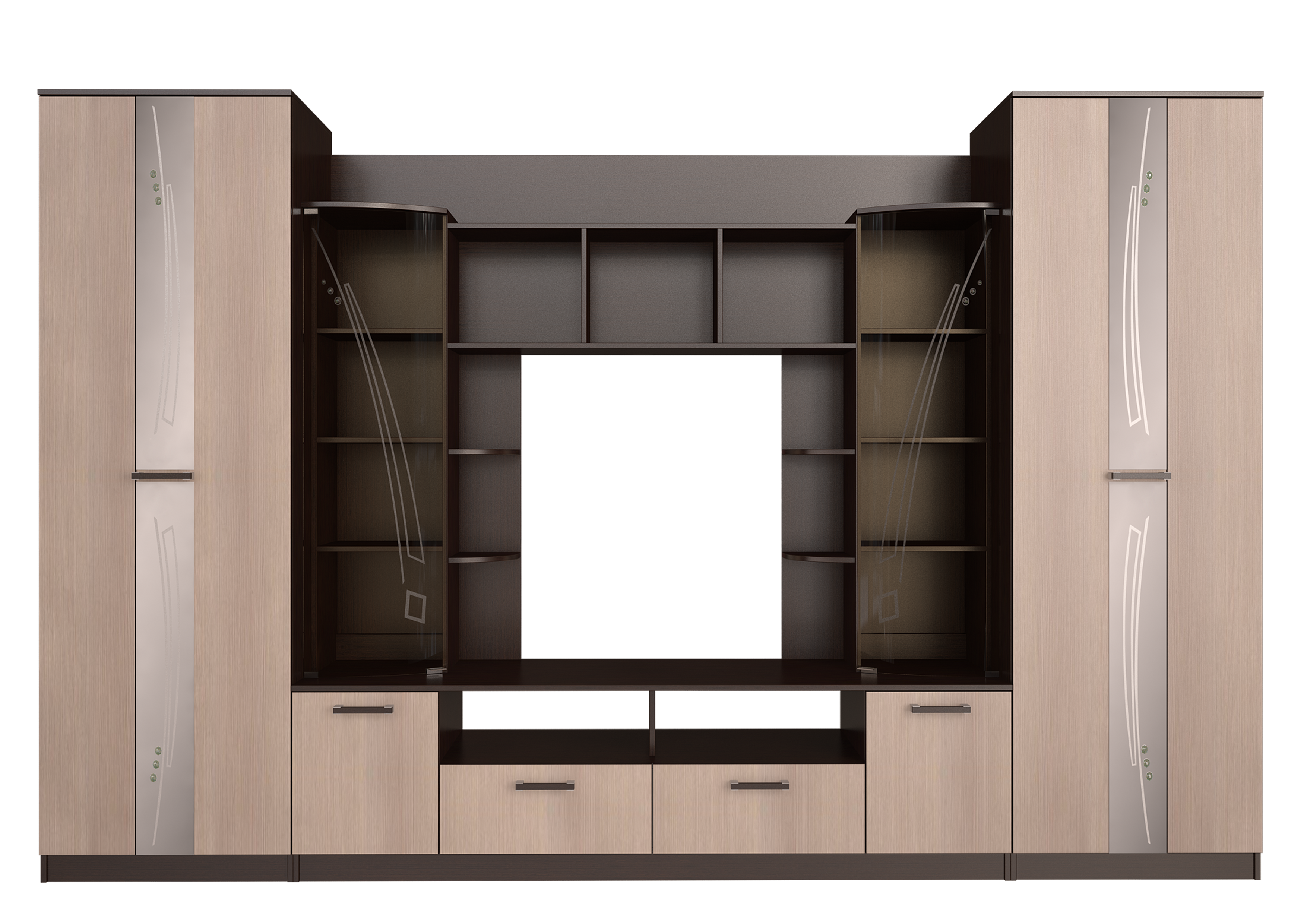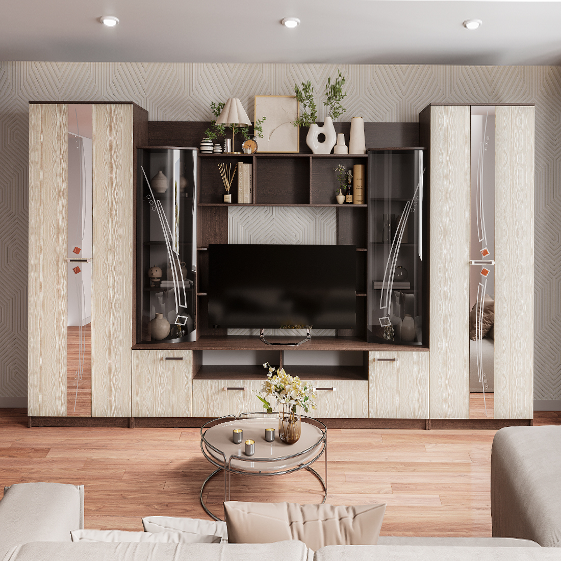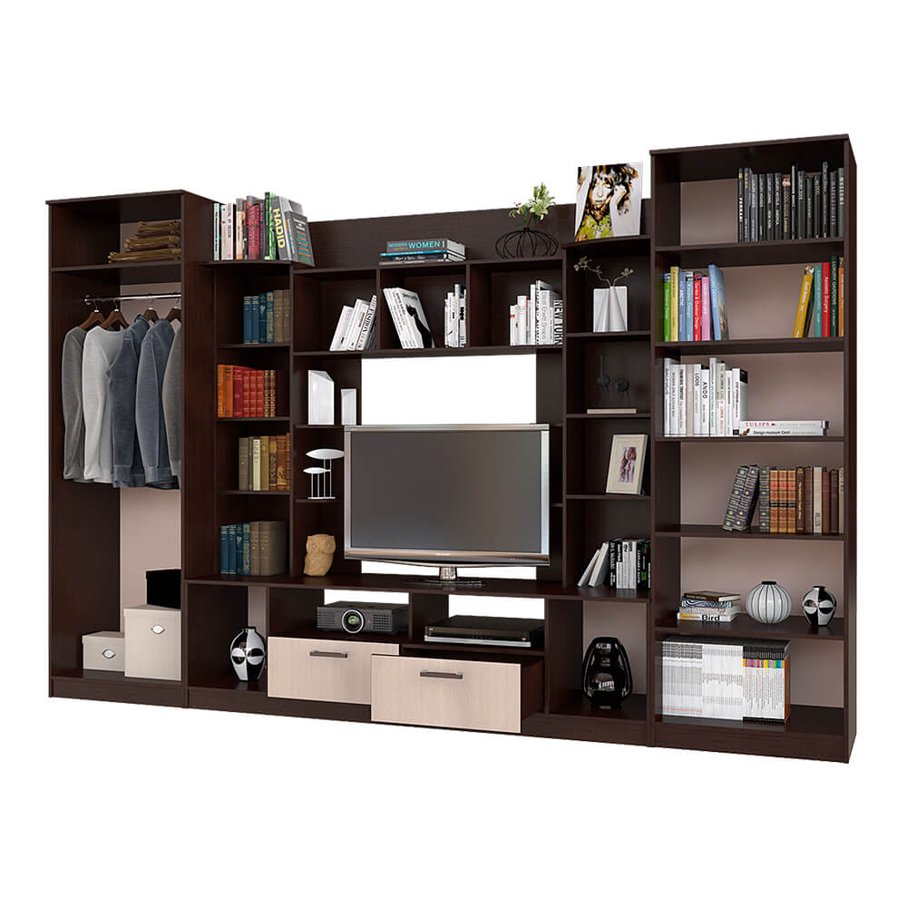 Гостиная «Венеция» – идеальный вариант для размещения большого количества вещей, включая одежду, ведь данная модель имеет зоны для ее хранения. ТВ-зона, выдвижные ящики, ниши для техники и открытые полки гармонично вписаны в дизайн гостиной.