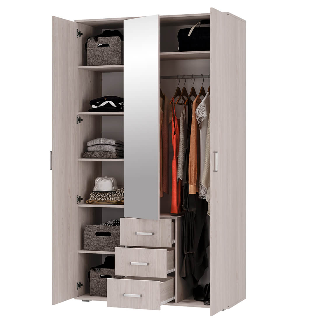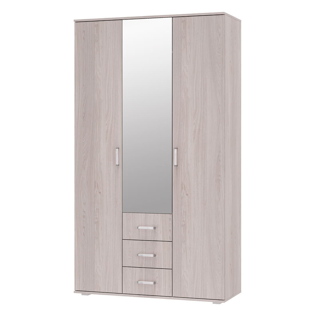 Трёхстворчатый шкаф "Белла" станет незаменимым помощником в хранении ваших вещей. Модель имеет отделение с хромированной штангой для одежды на вешалках, три выдвижных ящика, а также зону с полками. На центральный фасад прикреплено высокое зеркало.