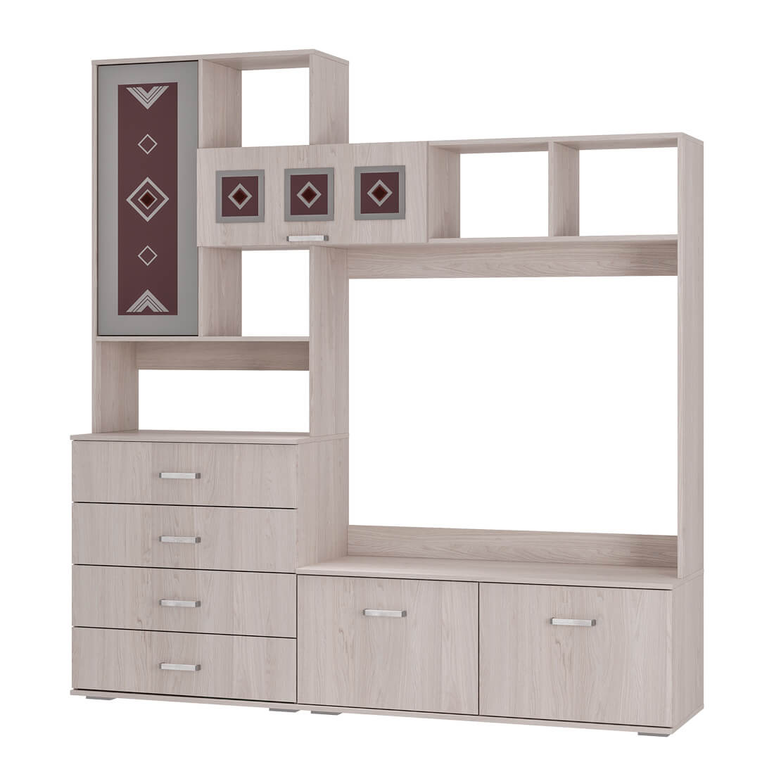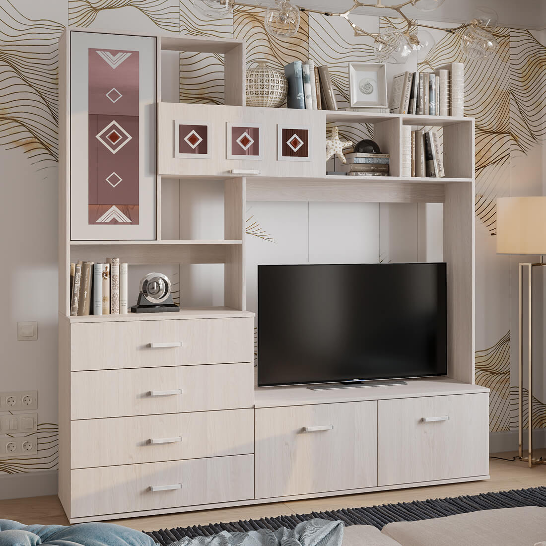 Гостиная "Белла" - это функциональная стилизованная модель. Особый шарм ей придаёт сочетание корпуса и фасада в цвете "ясень белый", а также отделка зеркалами бронзового оттенка с фьюзингом (художественные вставки из цветного стекла), пескоструйной обработкой и еврокромкой. Удобная зона для ТВ, вместительные выдвижные ящики, закрытые и открытые полки позволяют максимально эффективно использовать пространство.