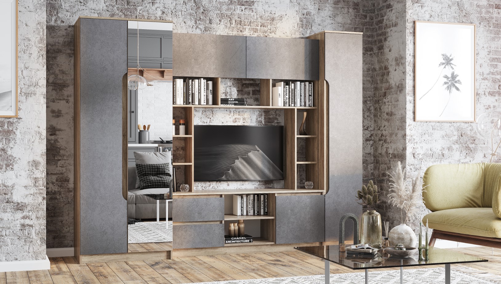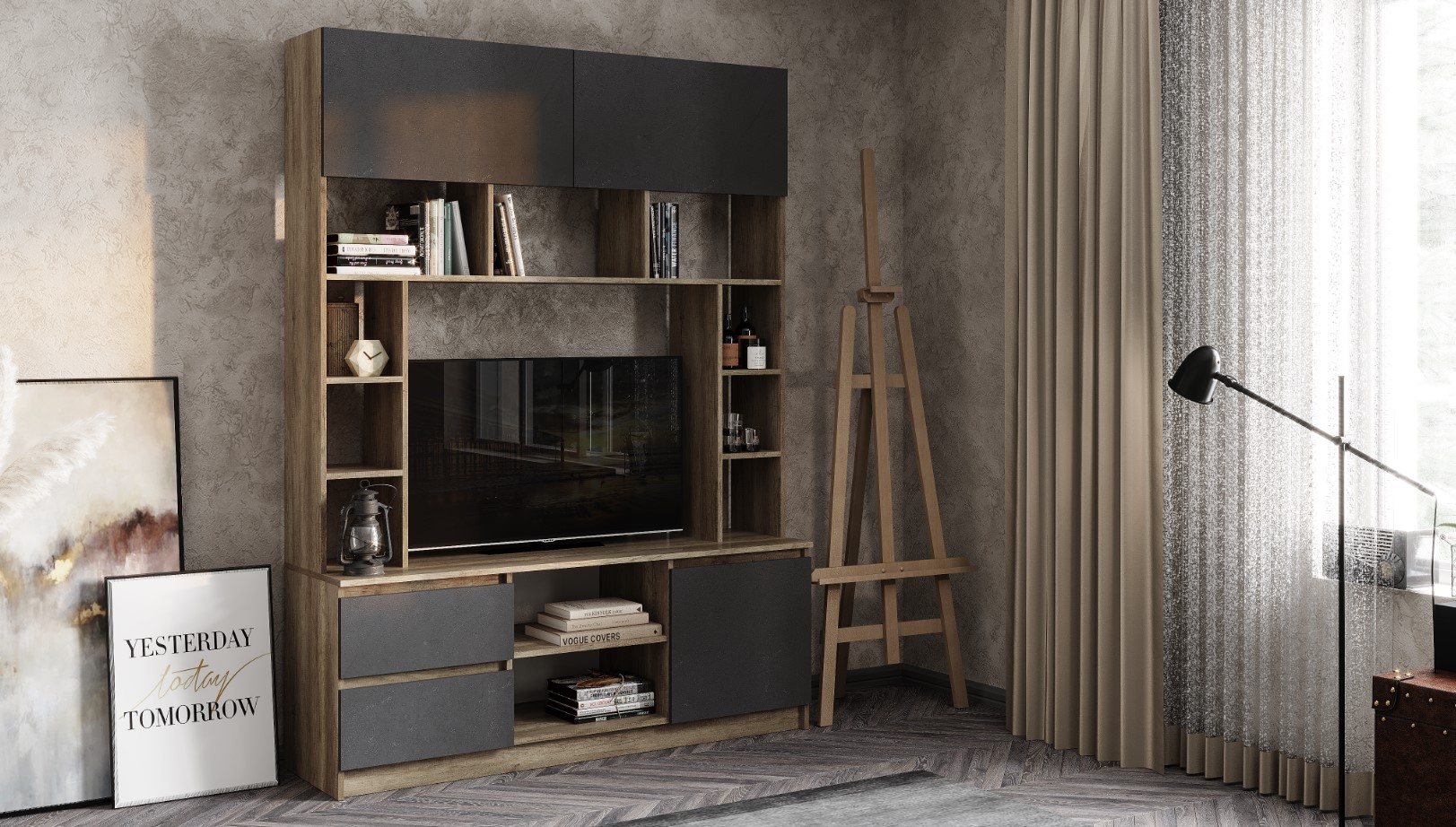 Невероятно стильная гостиная "Прайм" привлечёт к себе внимание и станет украшением вашей квартиры. Модель содержит все необходимые зоны для хранения вещей, предметов декора, техники или сувениров. На столешнице разместиться телевизор. Изделие выполнено из ЛДСП в теплом цвете "дуб каньон", а фасады распашных дверок и выкатных ящиков изготовлены в темном цвете. Такое сочетание придает гостиной стиля и делает ее очень современной.