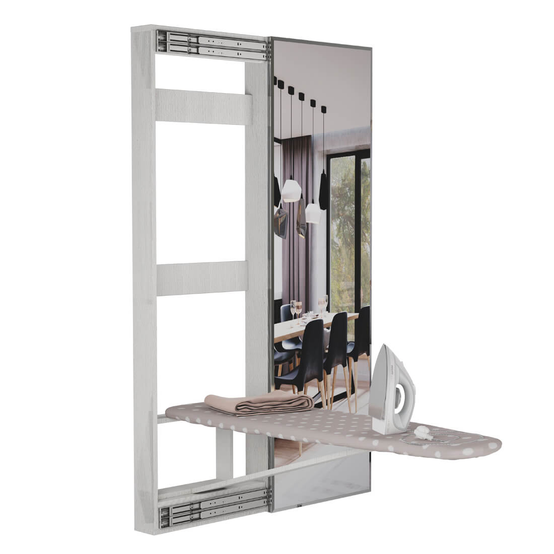 Гладильная доска - зеркало надежно крепится к каркасу с помощью прочной трельяжной петли.