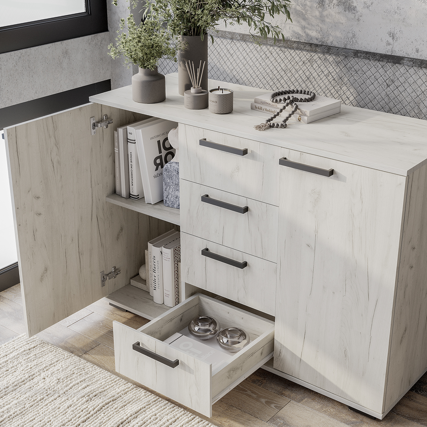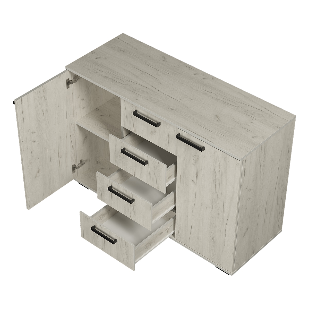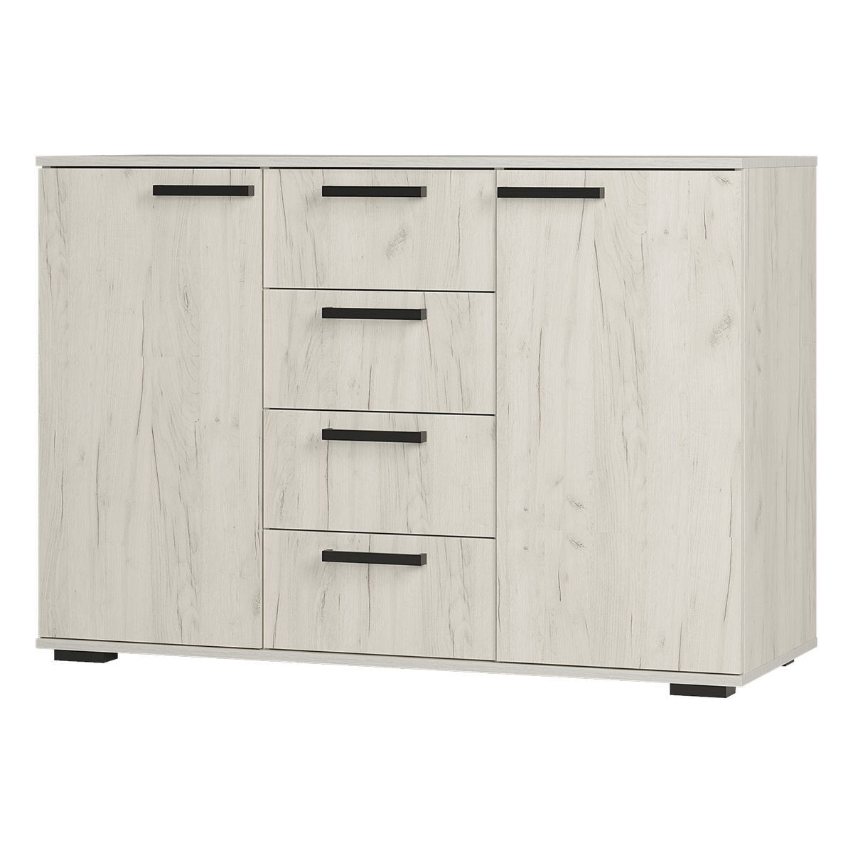Комод «Стандарт № 2» – прекрасный выбор для спальни или гостиной! Данная модель состоит из четырех центральных выдвижных ящиков, а также двух боковых секций с распашными дверцами. Комод позволит вместить большое количество вещей, одежды и любых мелочей.