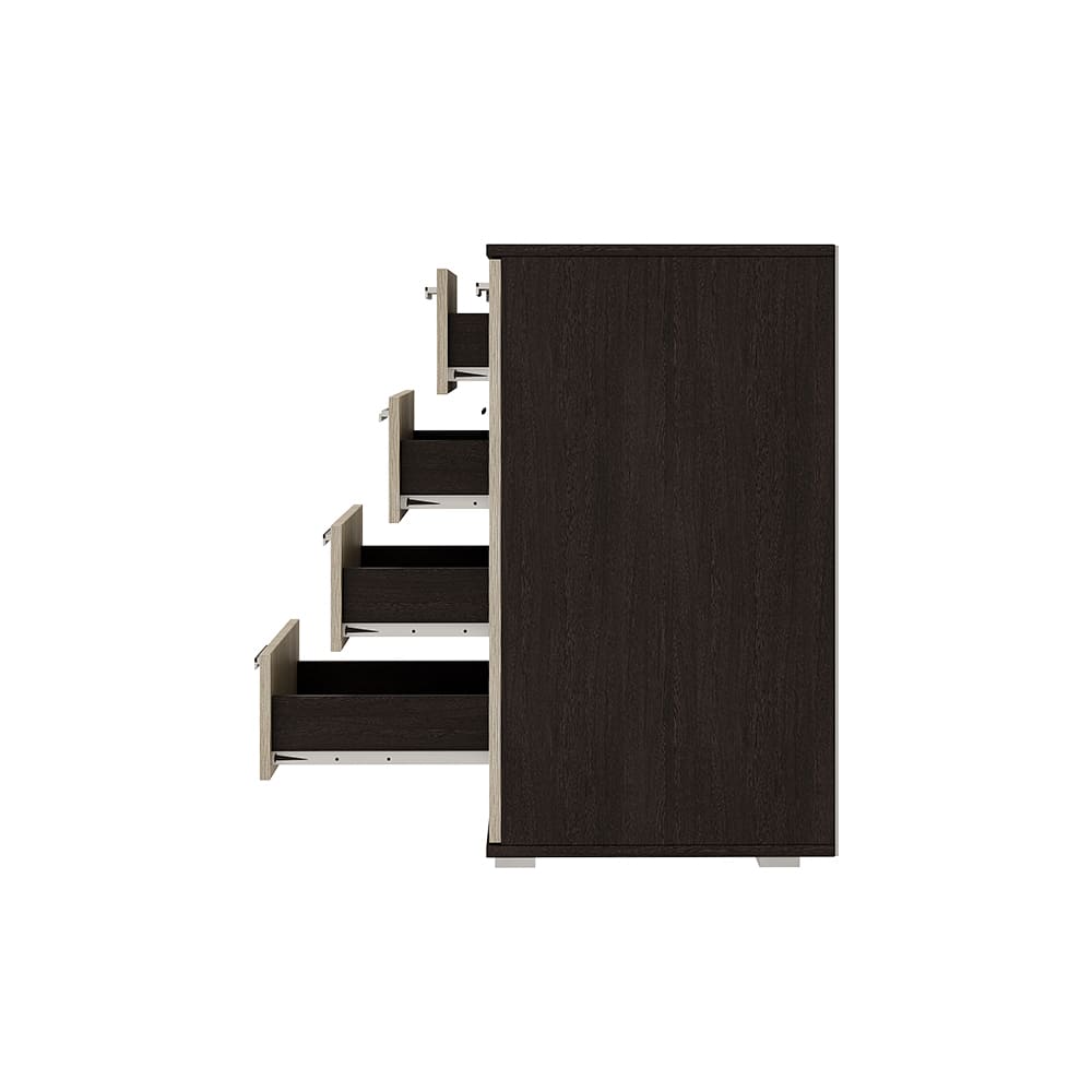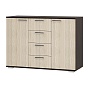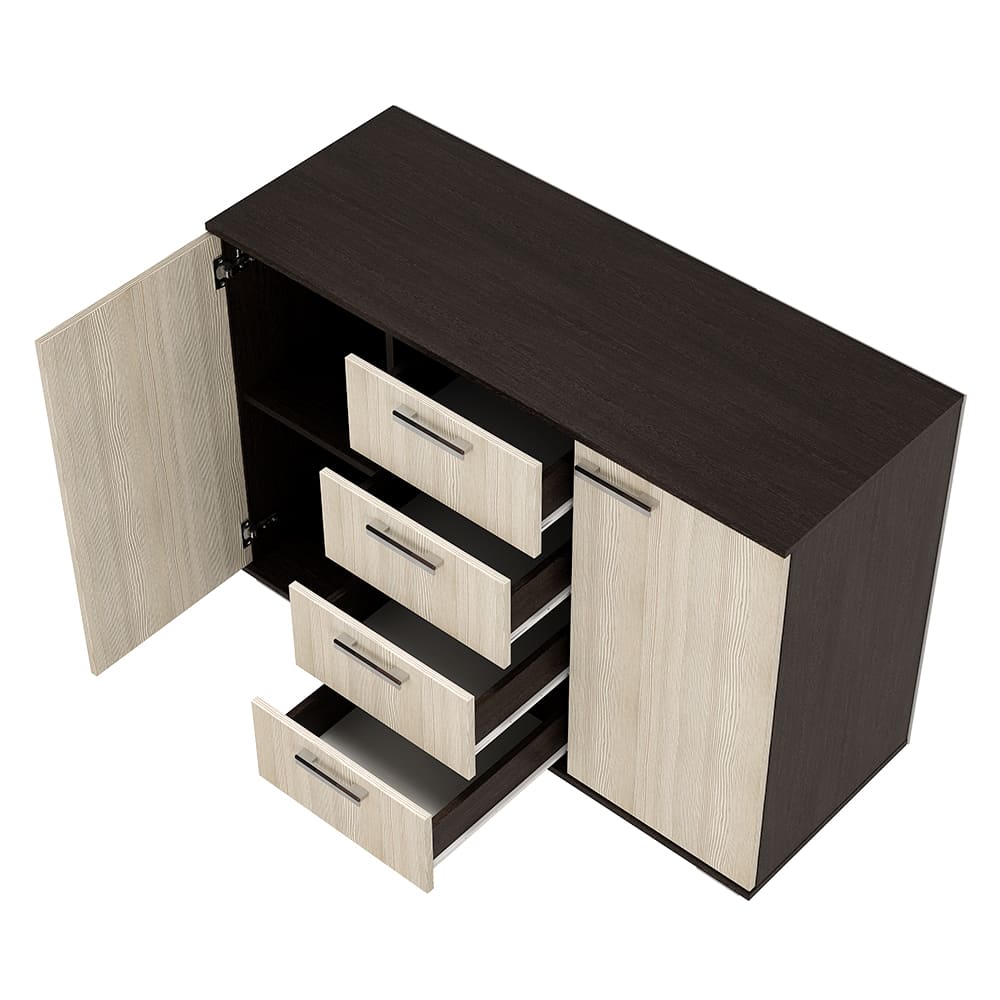 Комод «Стандарт № 2» – прекрасный выбор для спальни или гостиной! Данная модель состоит из четырех центральных выдвижных ящиков, а также двух боковых секций с распашными дверцами. Комод позволит вместить большое количество вещей, одежды и любых мелочей.