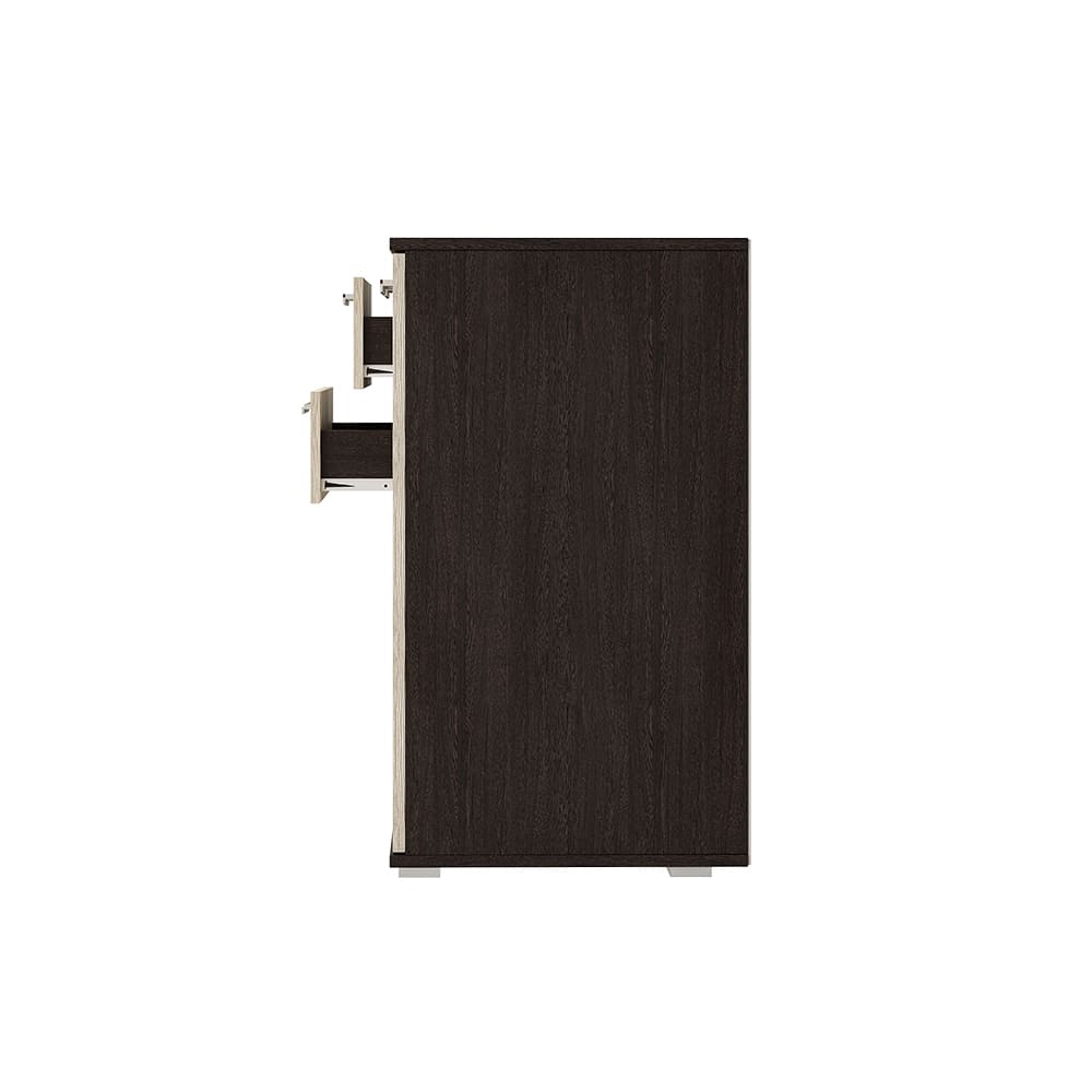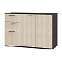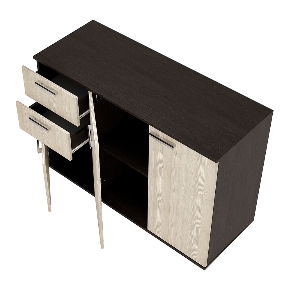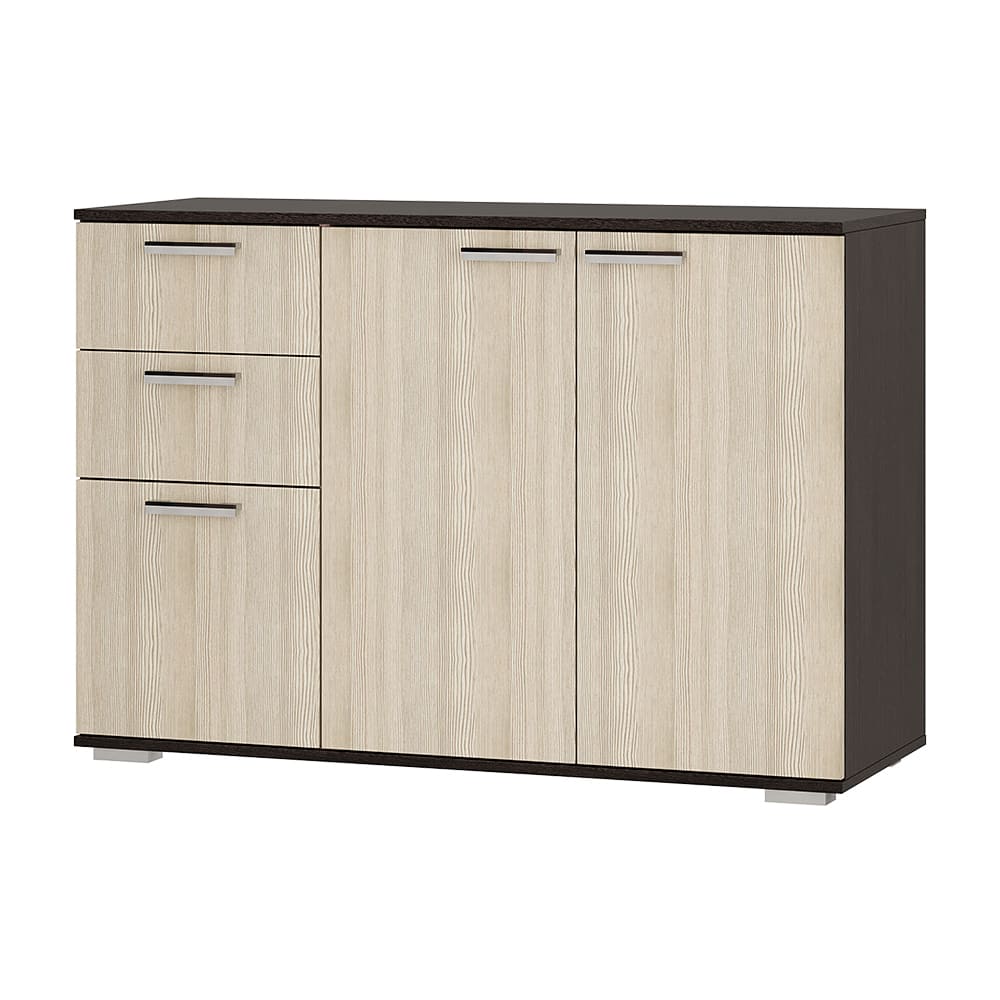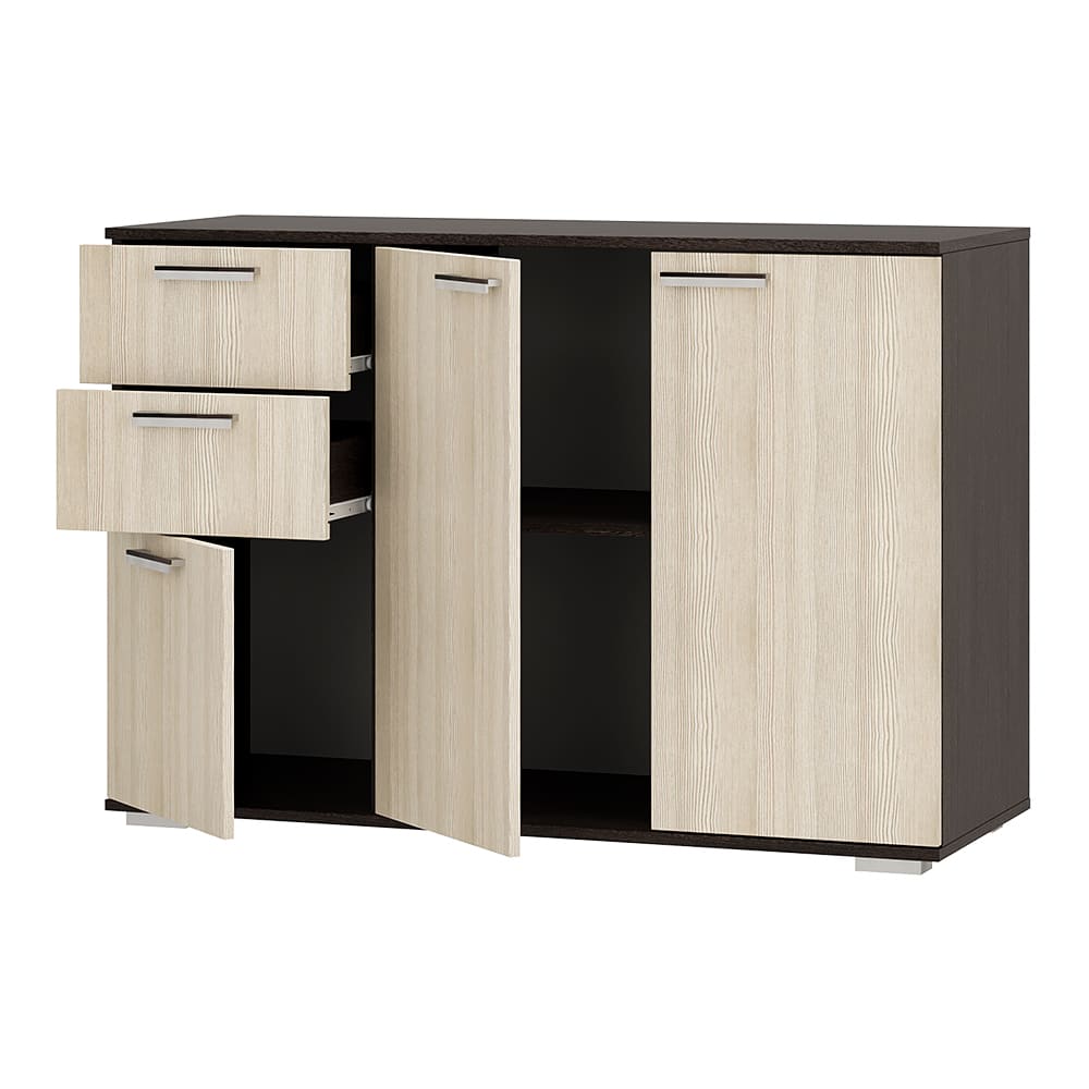 Комод «Стандарт № 3» имеет необычное размещение полок и ящиков. Основная часть изделия состоит из двух распашных дверок, за которыми находятся места для хранения вещей. Левая часть комода представляет собой два выдвижных ящика и нижнюю секцию также с распашной дверцей и полками.