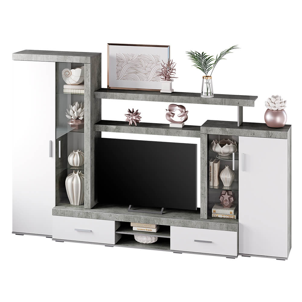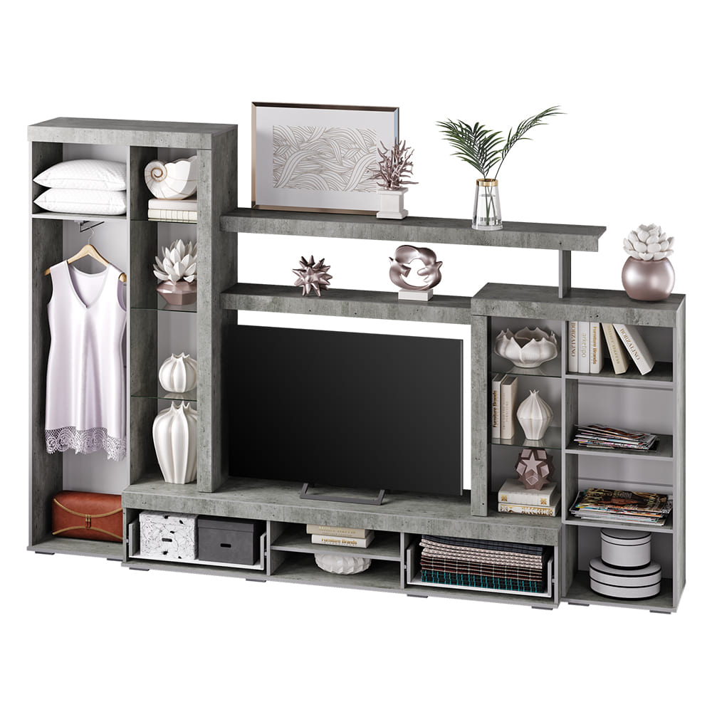 Гостиная "Инстайл" является частью одноименной модульной коллекции, все предметы которой идеально сочетаются между собой. Цвет "бетон" корпуса в комбинации с белыми матовыми фасадами и вставками из стекла придают гостиной "Инстайл" легкости. Два распашных шкафа, в один из которого встроена выдвижная штанга (евроштанга), позволят разместить личные вещи и предметы гардероба. На нескольких открытых полках вы сможете хранить сувениры, фотографии или предметы декора.