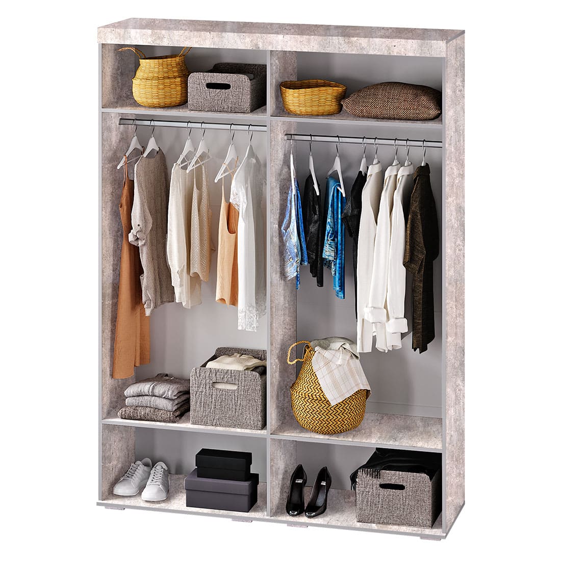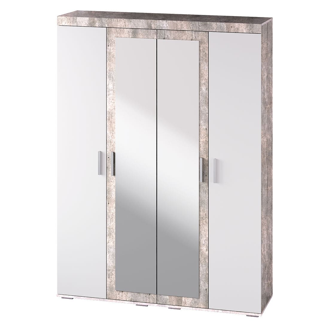Современный четырёхстворчатый шкаф "Инстайл" выполнен в стиле одноименной модульной коллекции мебели. Модель состоит из четырех дверок, две из которых – зеркальные. Изделие выполнено в комбинации белого и цвета "бетон". Шкаф состоит из двух отделений со штангами, а также верхних и нижних полок для вещей. По желанию Вы можете заменить штанги полками ПЛ-08, которые приобретаются отдельно.