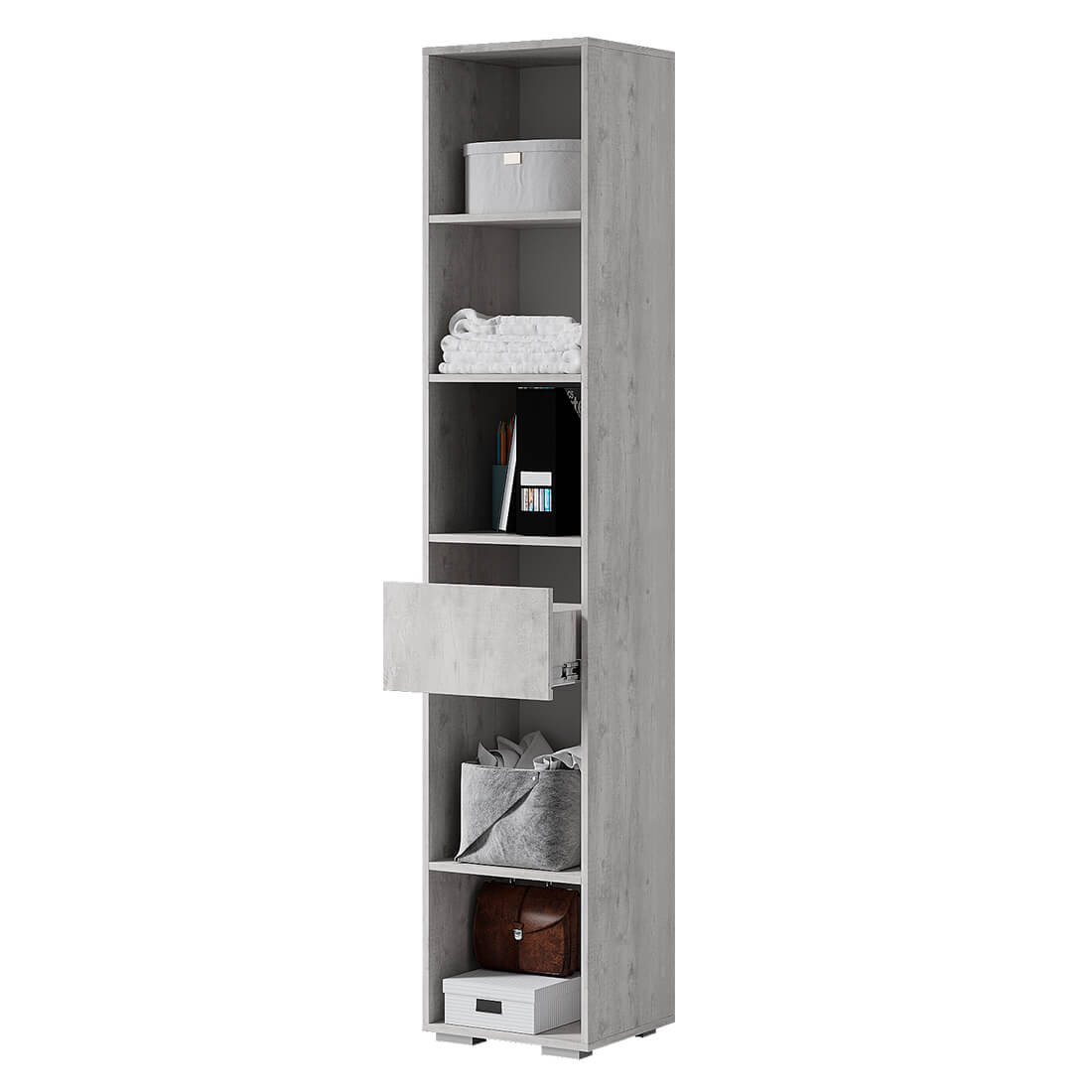Пенал "Мрия" ПН-11 – это удобная система хранения внутри и компактный элемент гостиной снаружи. Особую индивидуальность ей придаёт выдвижной ящик на шариковых направляющих, разделяющий пять вместительных полок по разным функциональным назначениям. На верхних полках можно хранить одежду или постельное бельё, а на нижних – сезонную обувь в коробках или игрушки вашего ребёнка.