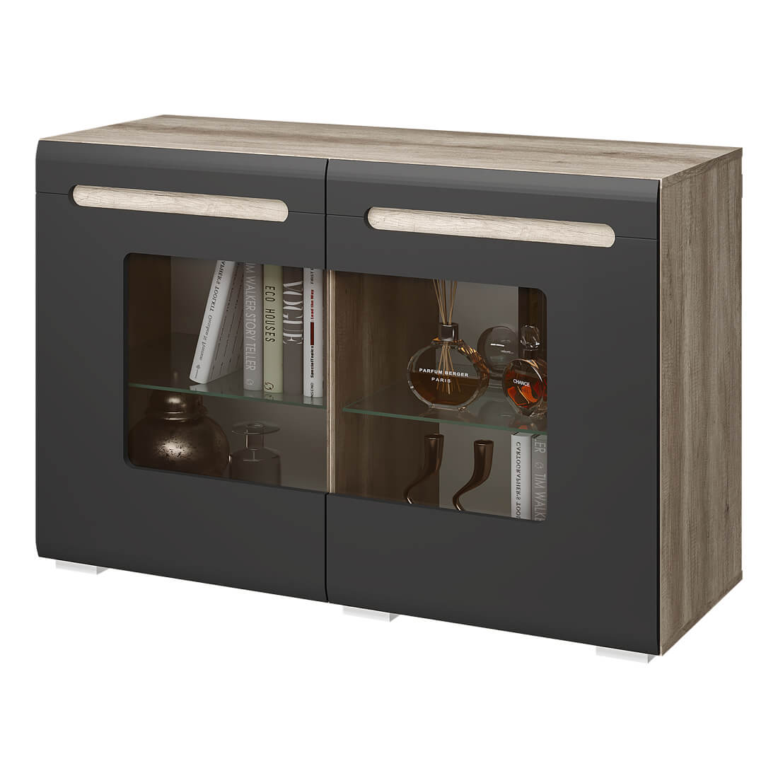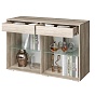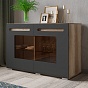 Большой комод "Наоми", выполненный в цвете "дуб каньон" с темными фасадами, может стать привлекательным акцентом любой комнаты. За двумя распашными дверцами, в которые встроены тонированные стекла, расположены полки для хранения посуды или сувениров. А в верхние выдвижные ящики можно положить какие-то мелочи, аксессуары или документы.