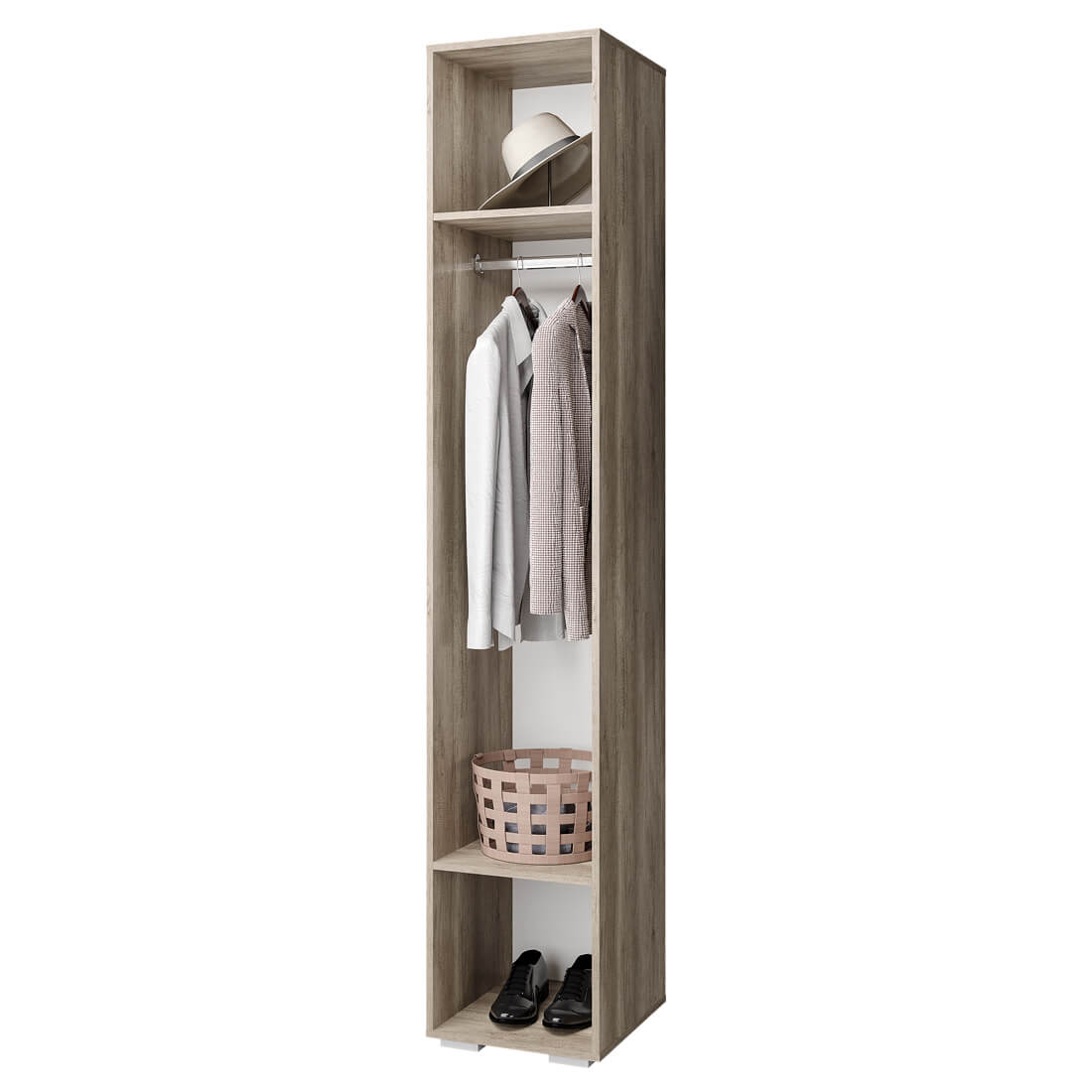 Дополнительным местом хранения вашего гардероба может стать пенал "Наоми". Данная модель состоит из отделения для одежды на вешалках и двух полок. Данная модель идет в комплекте с хромированной штангой. По желанию Вы можете заменить штангу дополнительными полками (3 шт - ПЛ-01). Полки приобретаются отдельно.