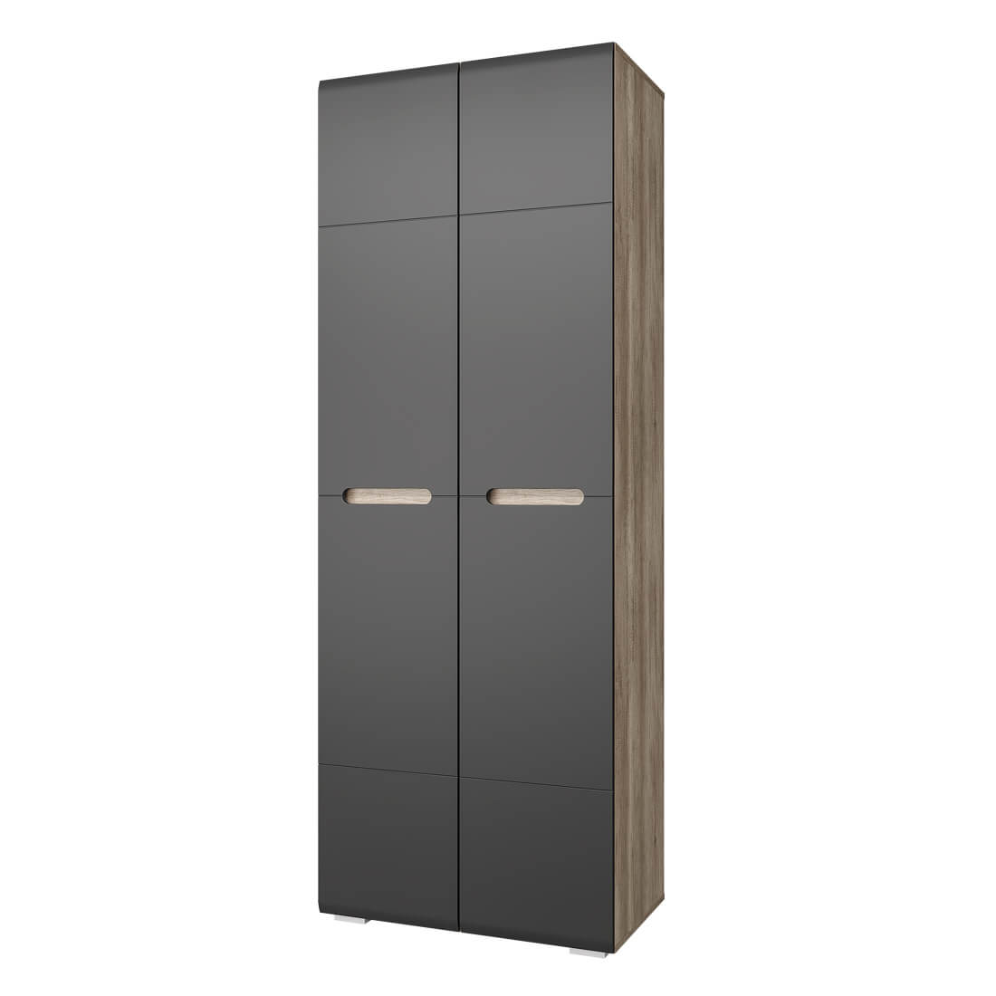 Шкаф распашной из серии "Наоми" – красивое и стильное решение для современного интерьера. Модель имеет две распашные створки, изготовленные из МДФ темного серого цвета, ручки являются частью фасадов. Шкаф состоит из вместительного отделения со штангой для одежды на вешалках и двух ниш для хранения трикотажа или обуви. Данная модель идет в комплекте с хромированной штангой. По желанию Вы можете заменить штангу дополнительными полками -3 шт (ПЛ-02). Полки приобретаются отдельно.