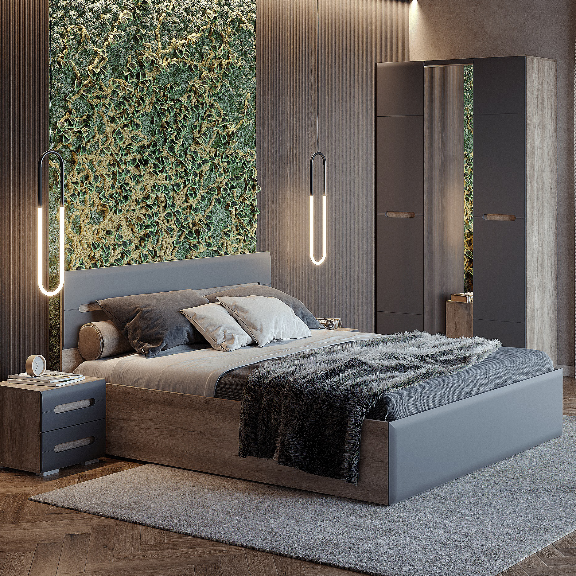 Модульная коллекция «Наоми» в декоре F24 – это стильное современное решение в контрастном сочетании корпуса «дуб каньон» с элегантным матовым фасадом насыщенного грифельного оттенка. Подобное сочетание цветов даёт полное основание коллекции стать хитом интерьера Вашей квартиры. Уникальная геометрия фрезерованных фасадов полностью отвечает опирающемуся на принципы минимализма духу времени и великолепно реализует свой выразительный потенциал в любом стилистическом формате; оригинальное конструктивное решение коллекции – ручки фасадов, выполненные путем сложной фрезеровки с максимально реалистичным декором дубового спила; выдвижные элементы коллекции оснащены шариковыми направ