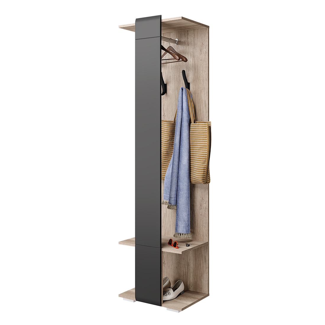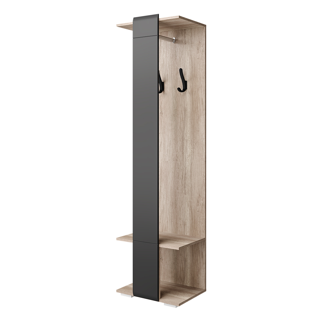 Напольная вешалка "Наоми" – практичное решение для небольшой прихожей. Функциональная модель оснащена всем необходимым для удобного хранения предметов гардероба, обуви и сопутствующих аксессуаров. Обратите внимание! Вешалку необходимо крепить к стене при помощи угловых навесов. Фурнитура входит в комплект. Изделие состоит из хромированный штанги для вешалок, крючков и полки. Фасад из темно-серой МДФ добавляет вешалке стиля.