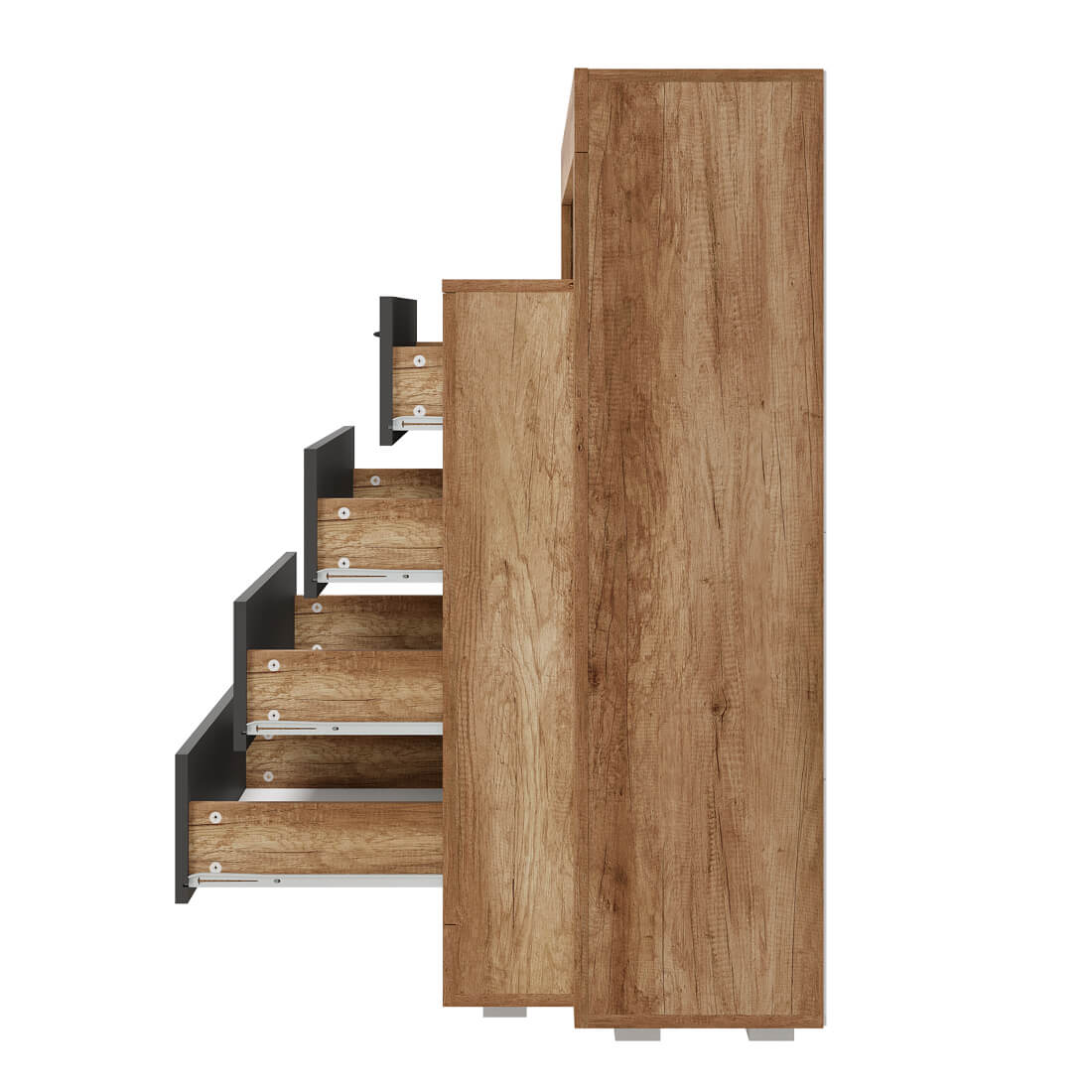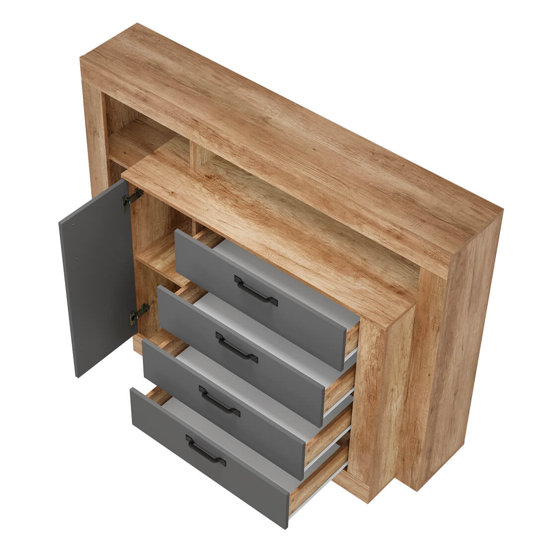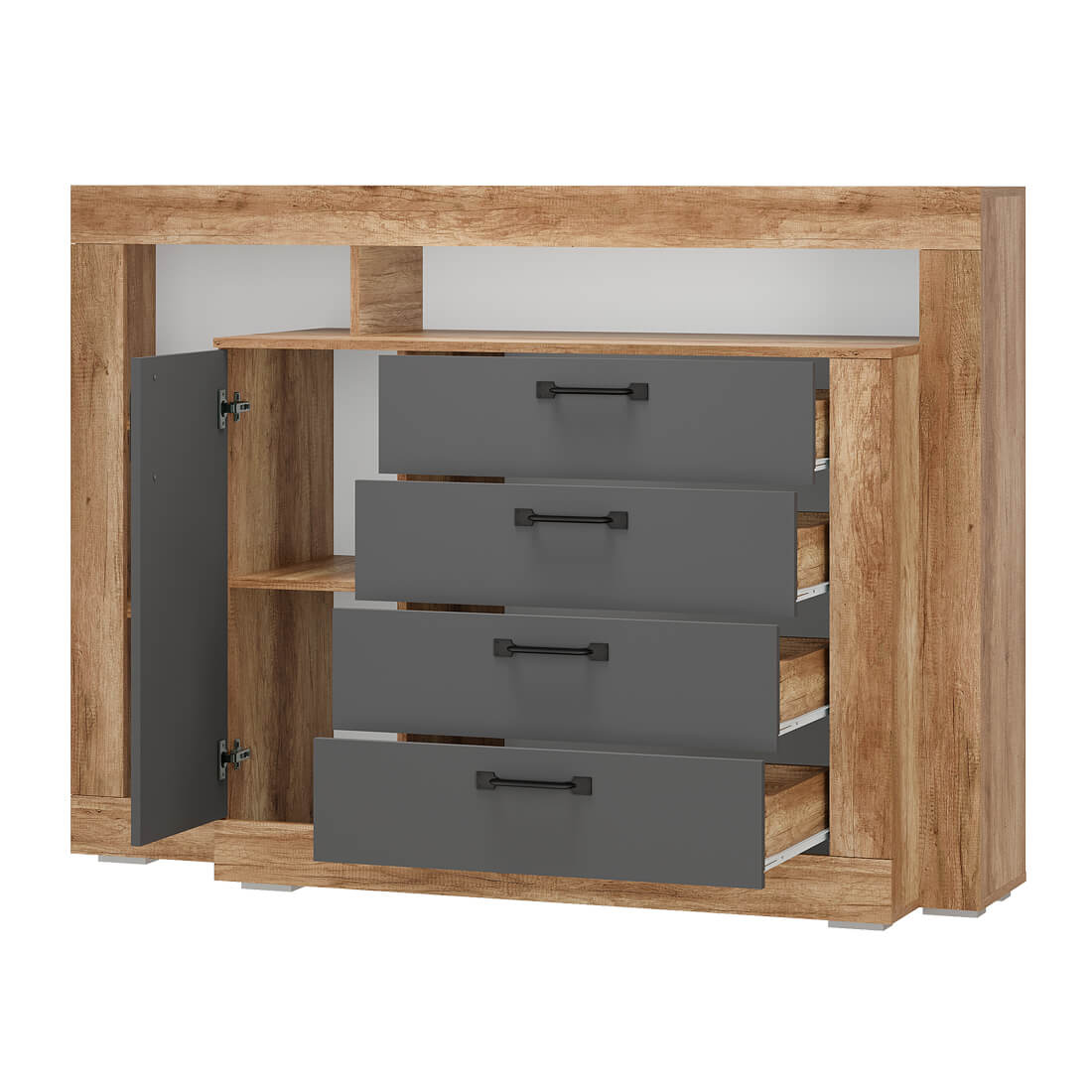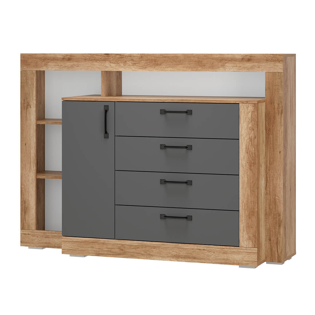 Комод многофункциональный "Прима" КМ-17 - удобная система хранения для одежды, постельных принадлежностей или других хозяйственных аксессуаров. Все необходимые вещи можно расположить на полках за распашной створкой, а также в трёх вместительных выдвижных ящиках на роликовых направляющих, которые обеспечивают легкую и бесшумную эксплуатацию модели. В открытых нишах можно разместить игрушки, книги, наборы для творчества и много других вещей.