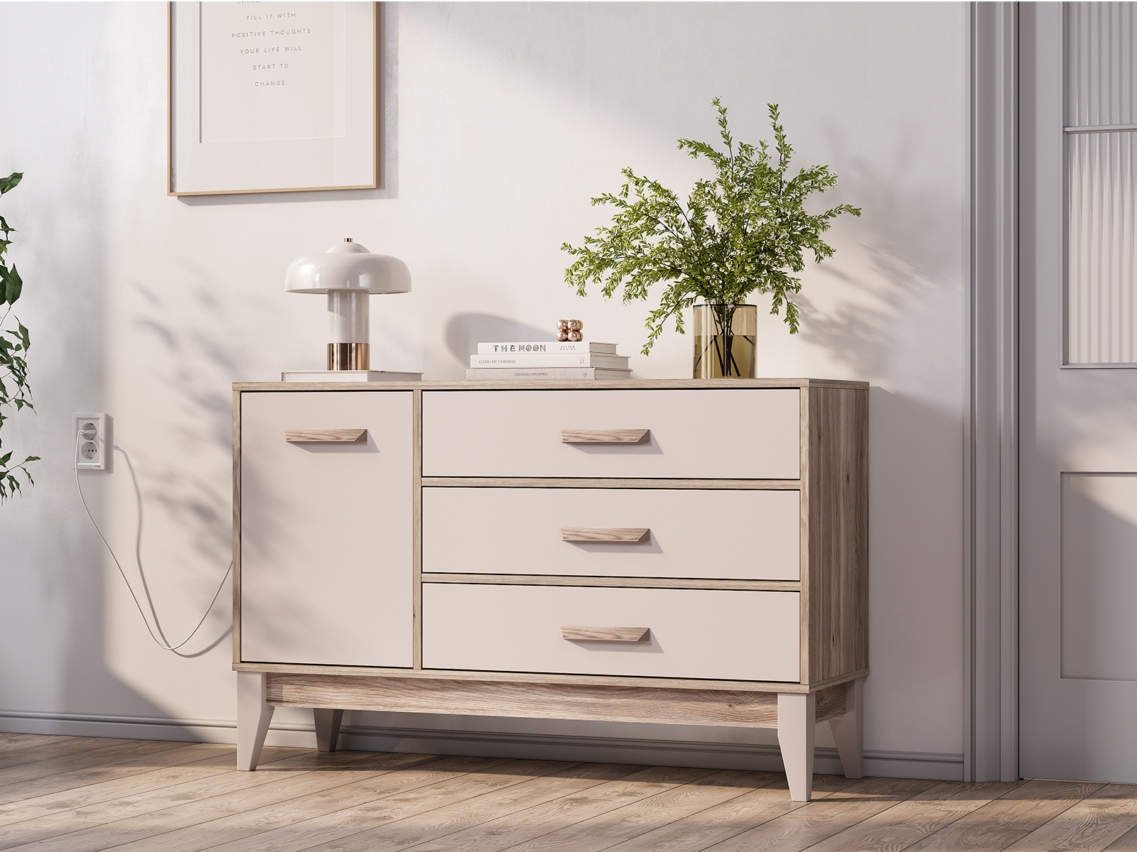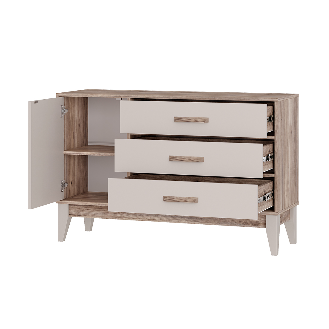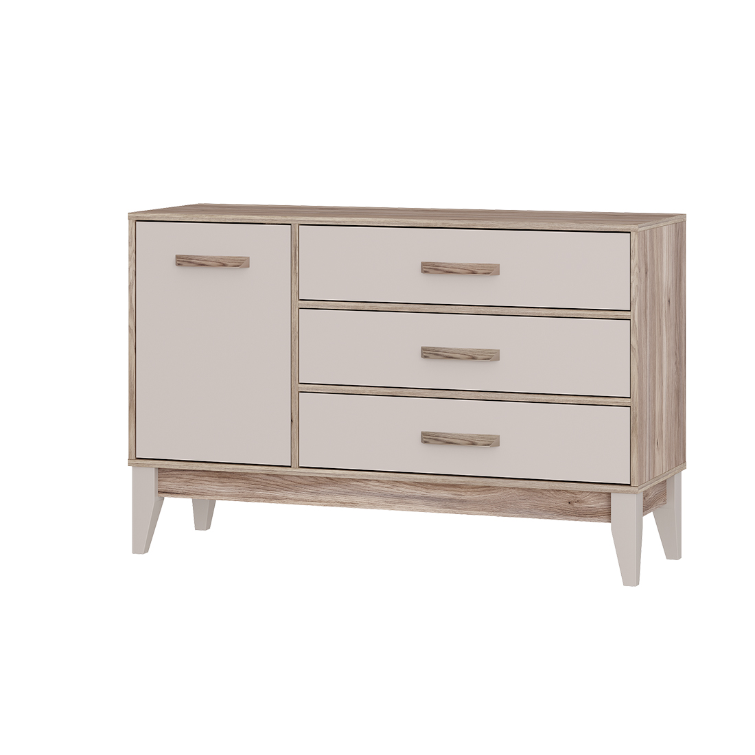 Комод «Скандика» КМ-12 – это не только вместительная, но и стильная модель, которая украсит вашу гостиную или спальню. Полка за дверцей подойдет для хранения важных мелочей, небольшой техники, фотоальбомов. Три просторных ящика позволят удобно рассортировать белье и одежду.