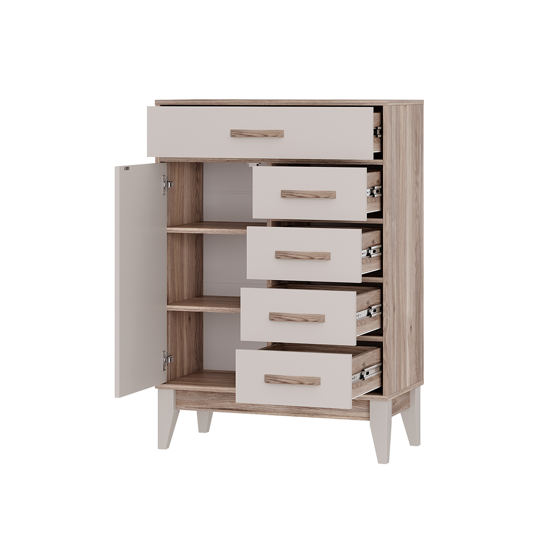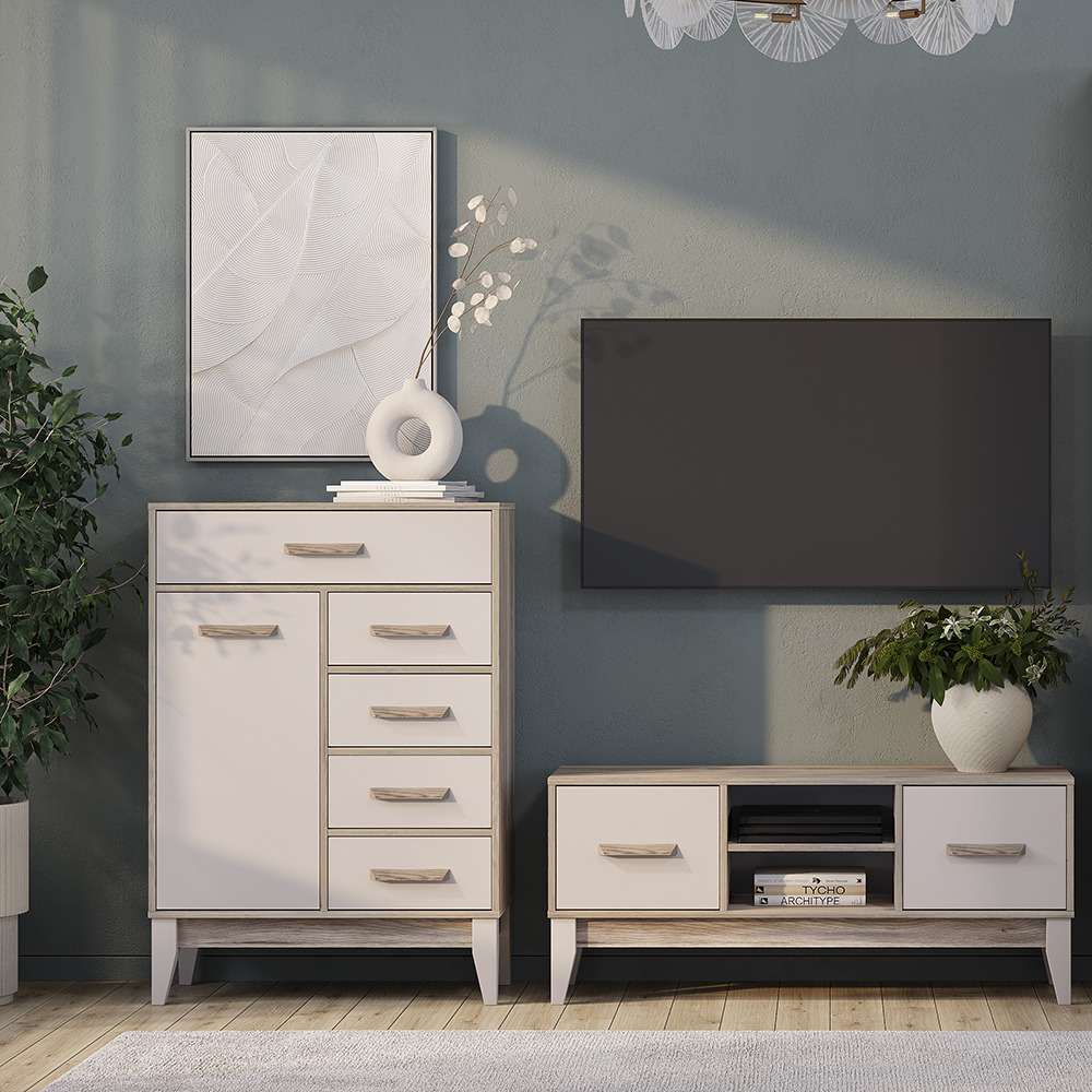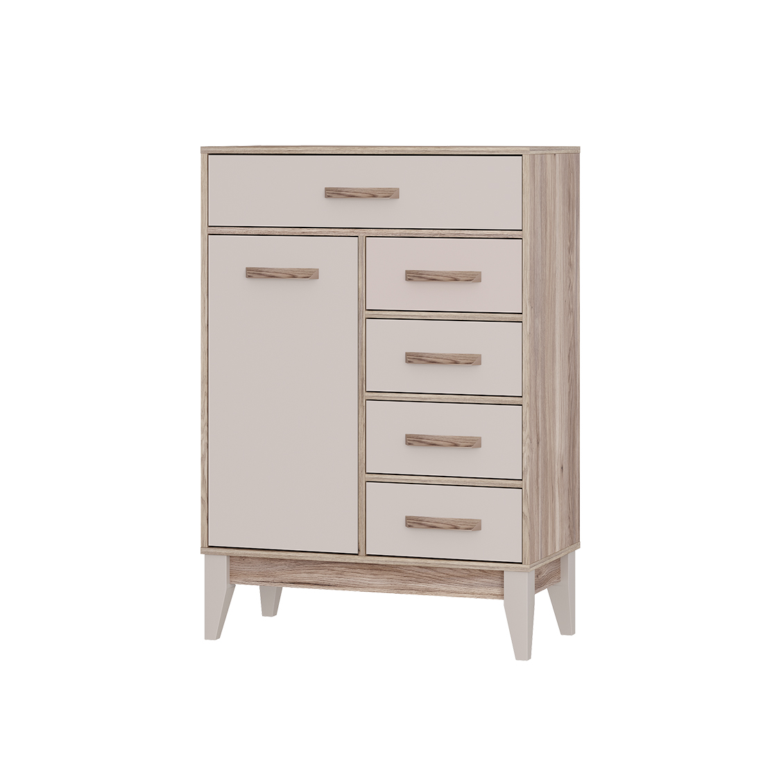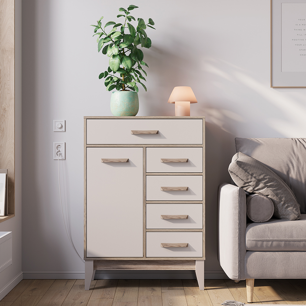 Комод «Скандика» – это компактная, но вместительная модель для гостиной или спальни. Благодаря вытянутой форме комод можно разместить на небольшом пространстве – например, возле дивана. Комод укомплектован четырьмя ящиками и отсеком с дверцей. В этой модели можно организовать несколько зон хранения, в ней поместятся и мелочи для рукоделия, и документы, и одежда.