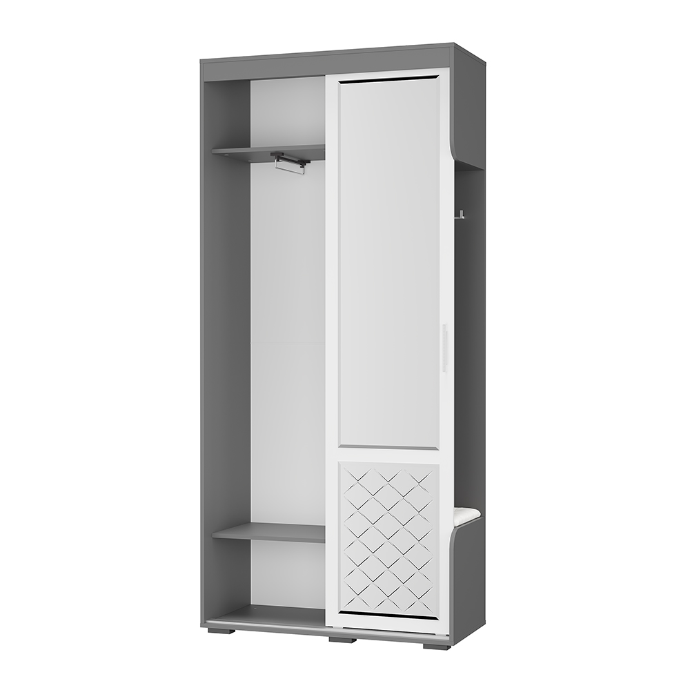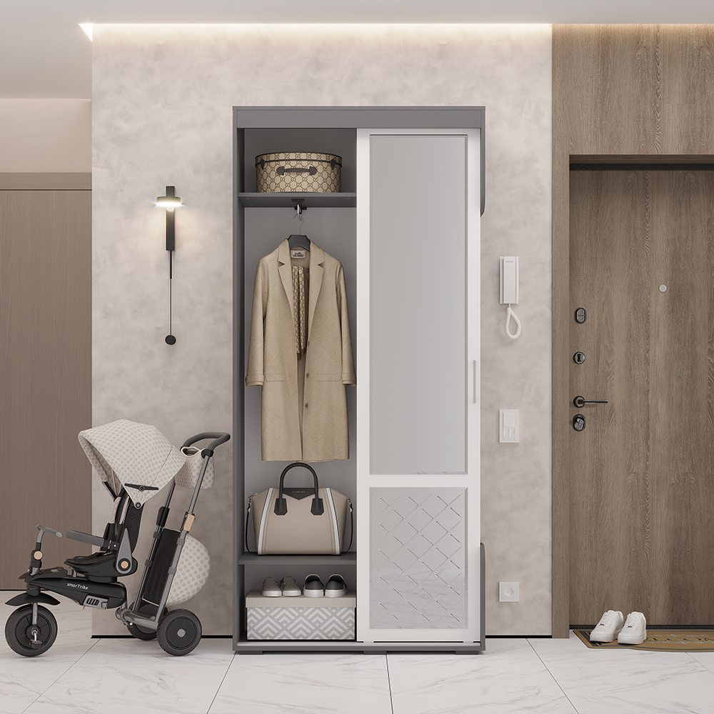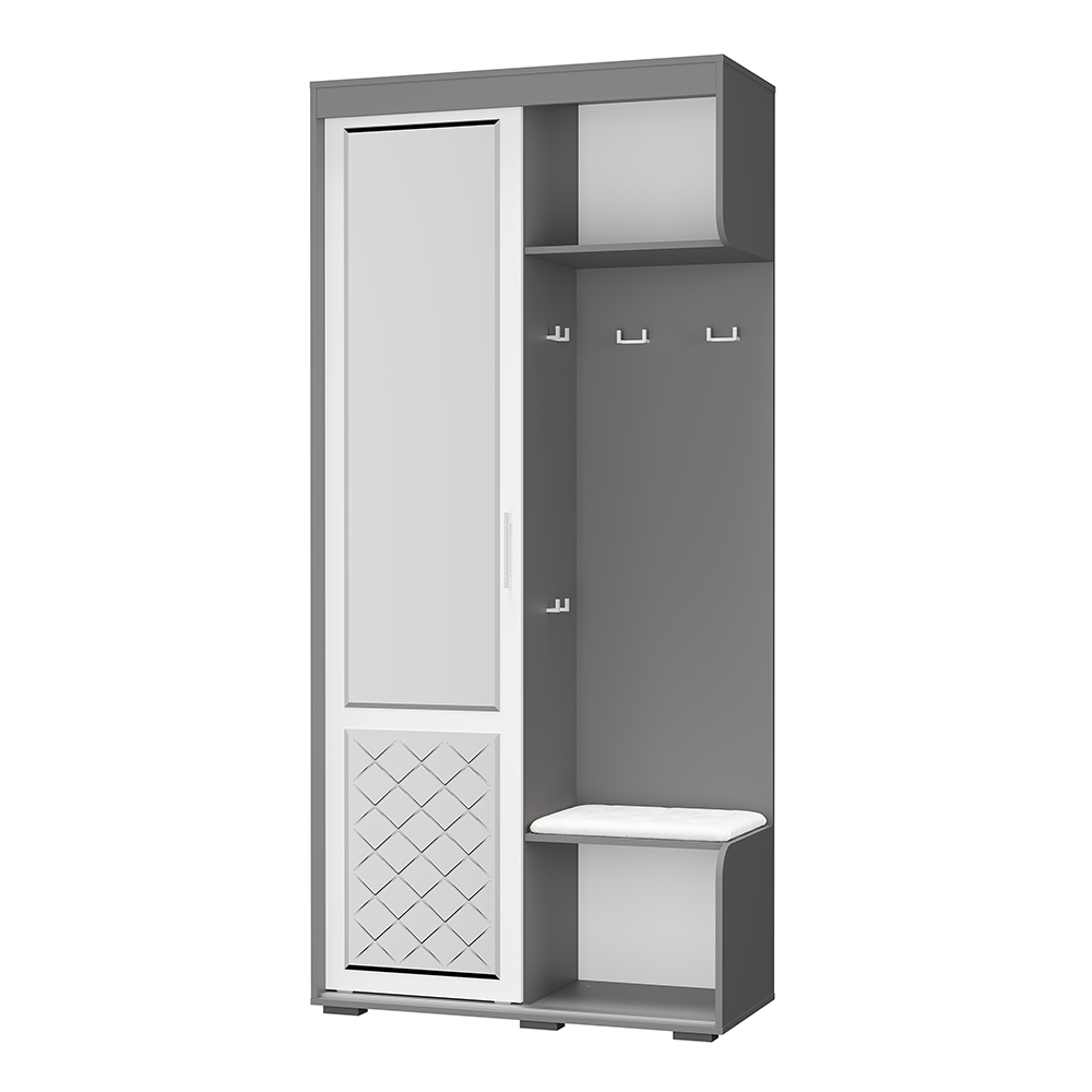 Элегантная прихожая "Варда" поможет разместить все необходимые вещи. Модель очень лаконична и не занимает много пространства. Дверца шкафа, за которой расположились полки и штанга для верхней одежды, оснащена двумя зеркалами. Прихожая имеет открытые крючки, нишу для обуви и небольшой пуф, обтянутый экокожей. Цветовое решение изделия позволит ему стать частью интерьера любого стиля.