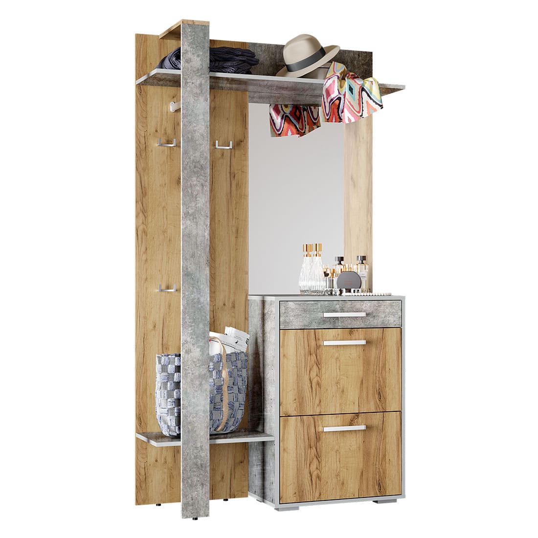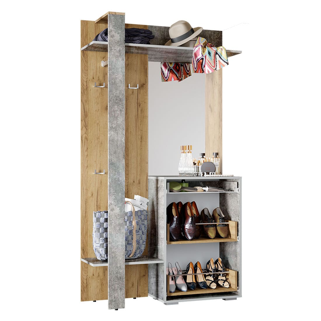 Благодаря Прихожей "Кензо" можно организовать удобную и продуманную систему хранения даже в небольшом помещении. На открытой панели со штангой, крючками и полками найдется место для верхней одежды, сумок, шарфов и зонтов. Для обуви предусмотрены выдвижные ящики. Ключи и прочие мелочи удобно держать на небольшом столике выше. Поправить прическу, головной убор или одежду можно благодаря навесному зеркалу, которое, к тому же, визуально расширяет пространство.