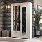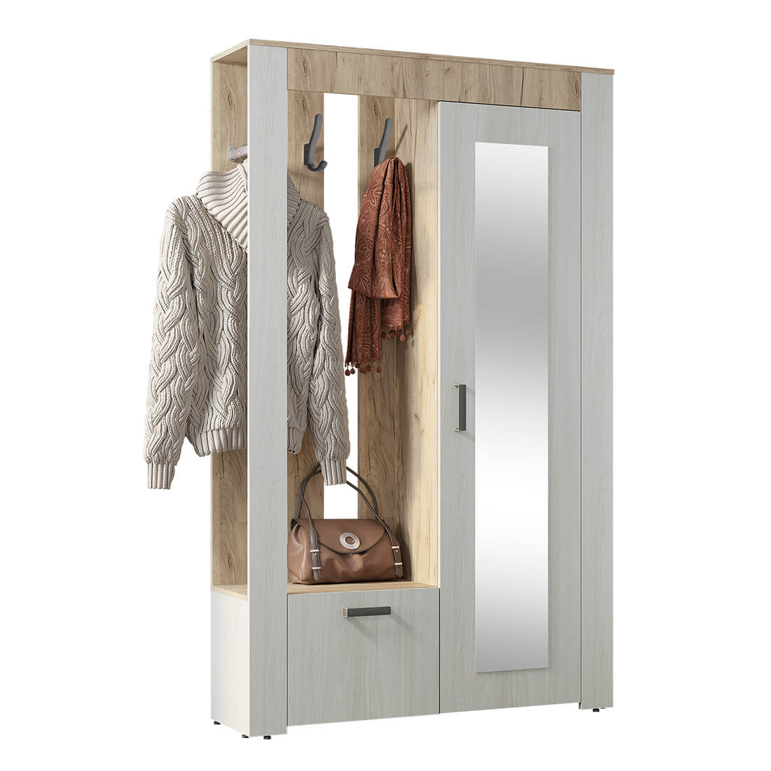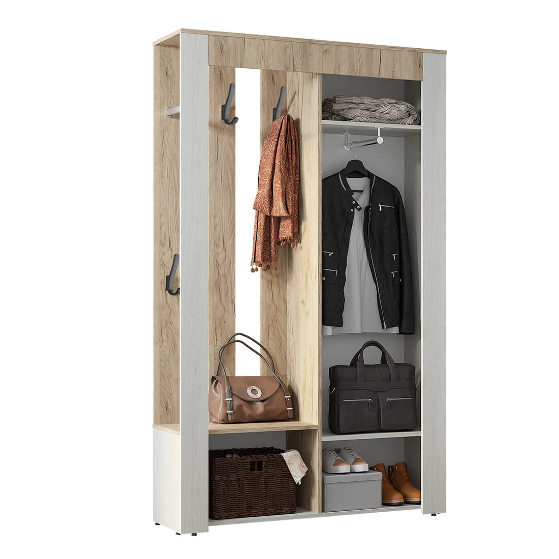 - наполнение представляет собой распашной шкаф со встроенным в дверцу зеркалом, открытую нишу с крючками для верхней одежды и отделение для хранения обуви,