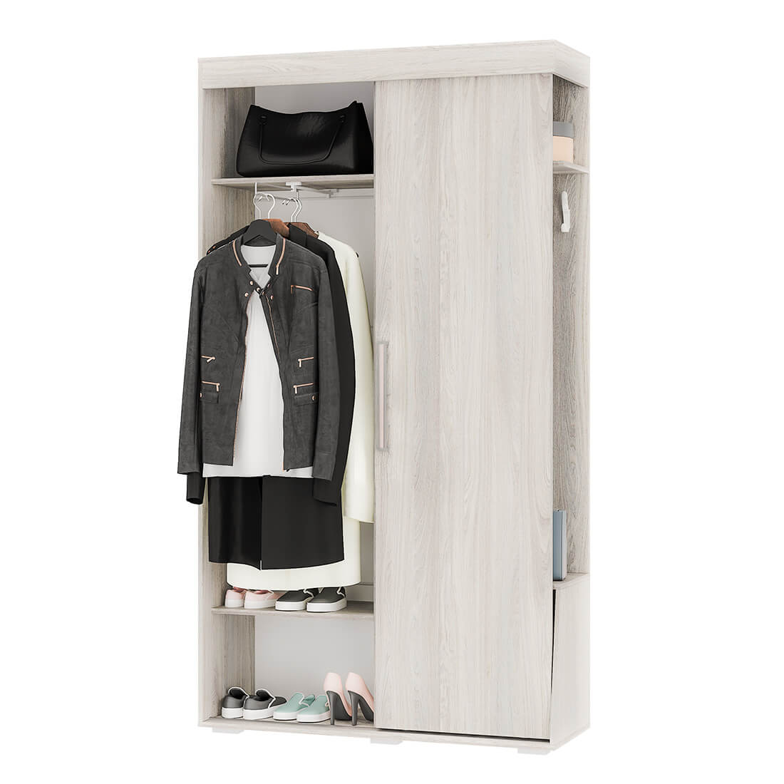 Современная прихожая «Зара», выполненная в спокойном цвете древесной фактуры ясень светлый, может гармонично вписаться в любой интерьер. Несмотря на свою компактность, прихожая имеет просторный шкаф с выдвижной штангой, антресольную полку для головных уборов, две открытых полки для обуви и удобные крючки для верхней одежды.