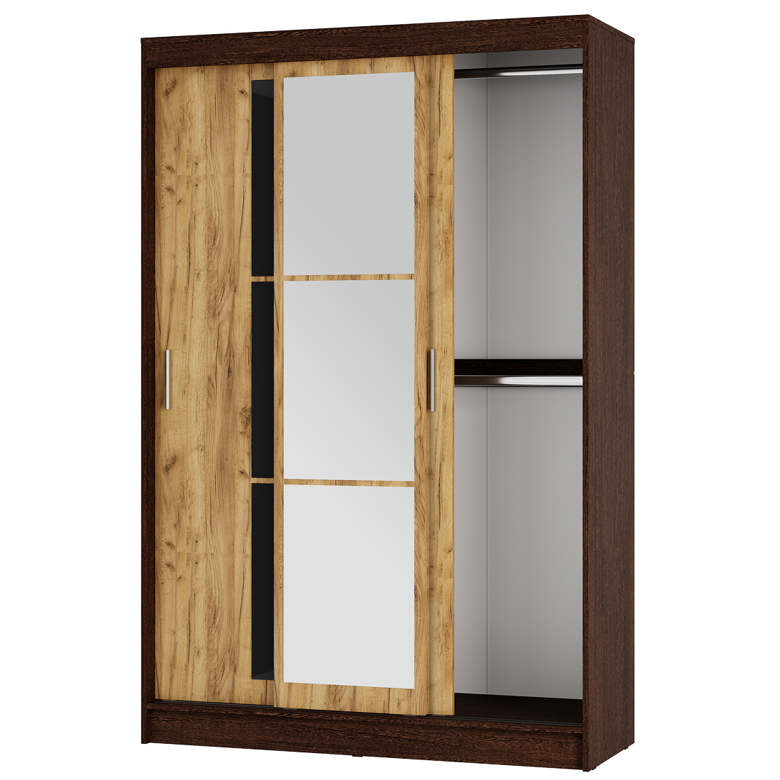Внутри с одной стороны находятся пять просторных полок для хранения вещей и постельного белья, с другой стороны – вместительная зона хранения с двумя горизонтальными хромированными штангами для одежды на вешалках.