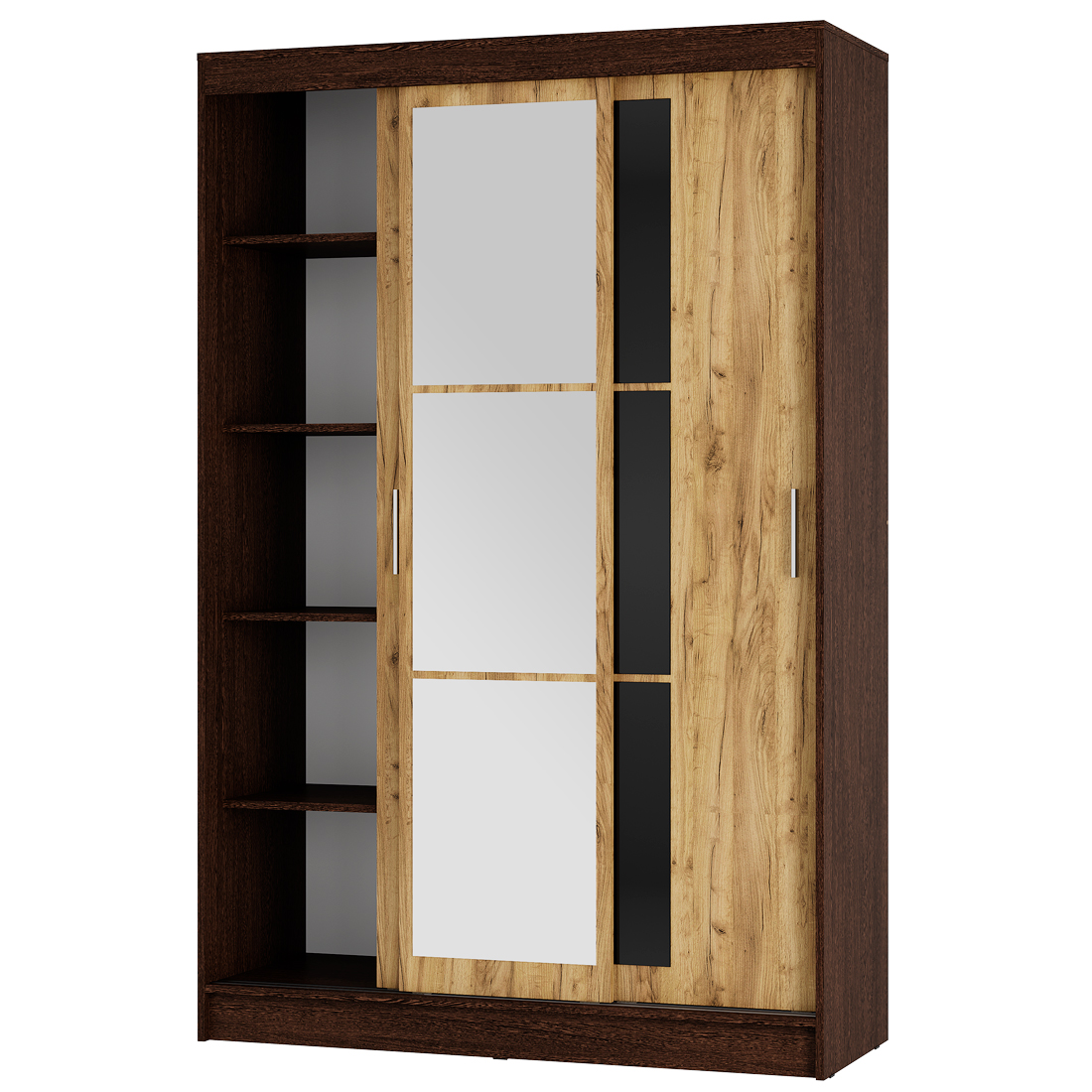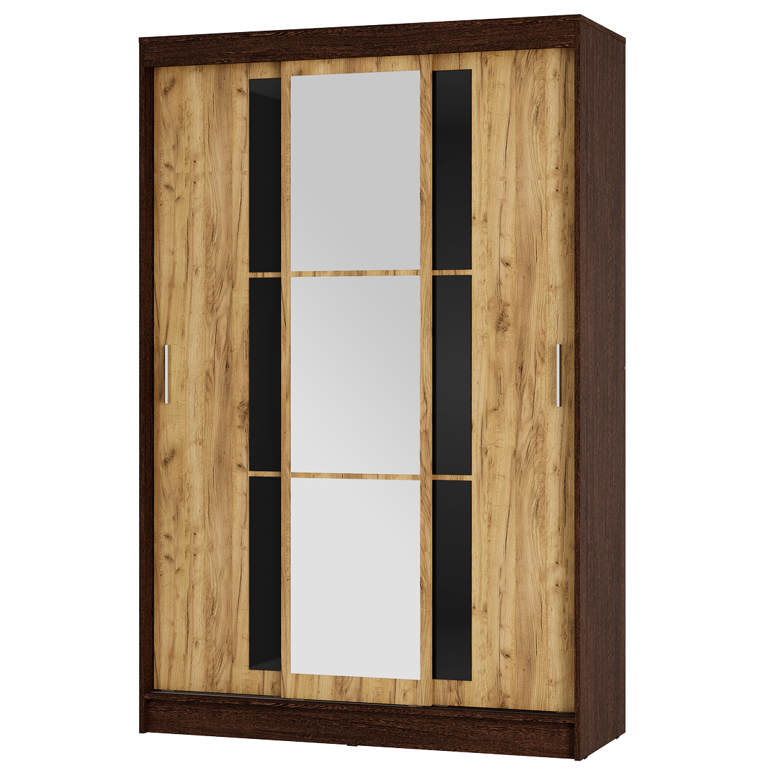 Раздвижные створки снабжены удобными ручками, центральная створка полностью декорирована тремя зеркалами с еврокромкой, которое создаёт иллюзию расширенного пространства, а на боковые створки наклеены по 3 стекла с лакобелью.