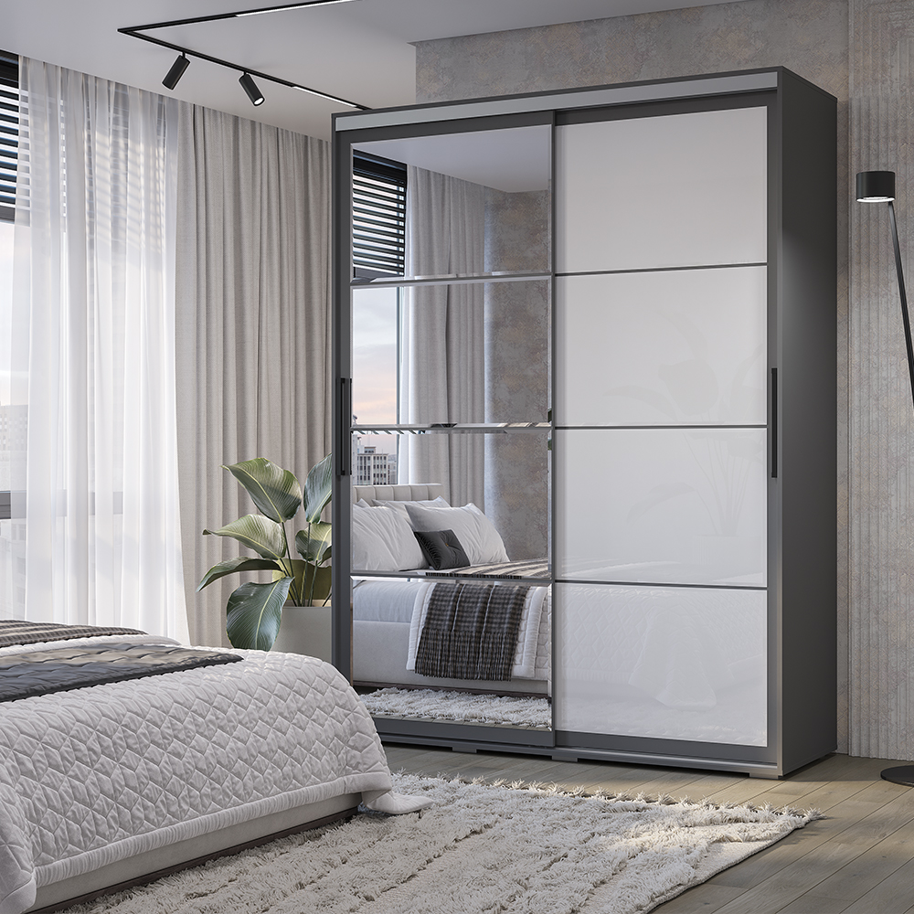 Шкаф-купе "Крафт" - это стильное и запоминающееся решение для организации хранения в вашем интерьере. Глубокий трендовый оттенок "графит" будет отлично гармонировать как со спокойными, так и с яркими оттенками в помещении. Зеркало - тип обработки фацет. Стекло - белый лакобель, тип обработки фацет.