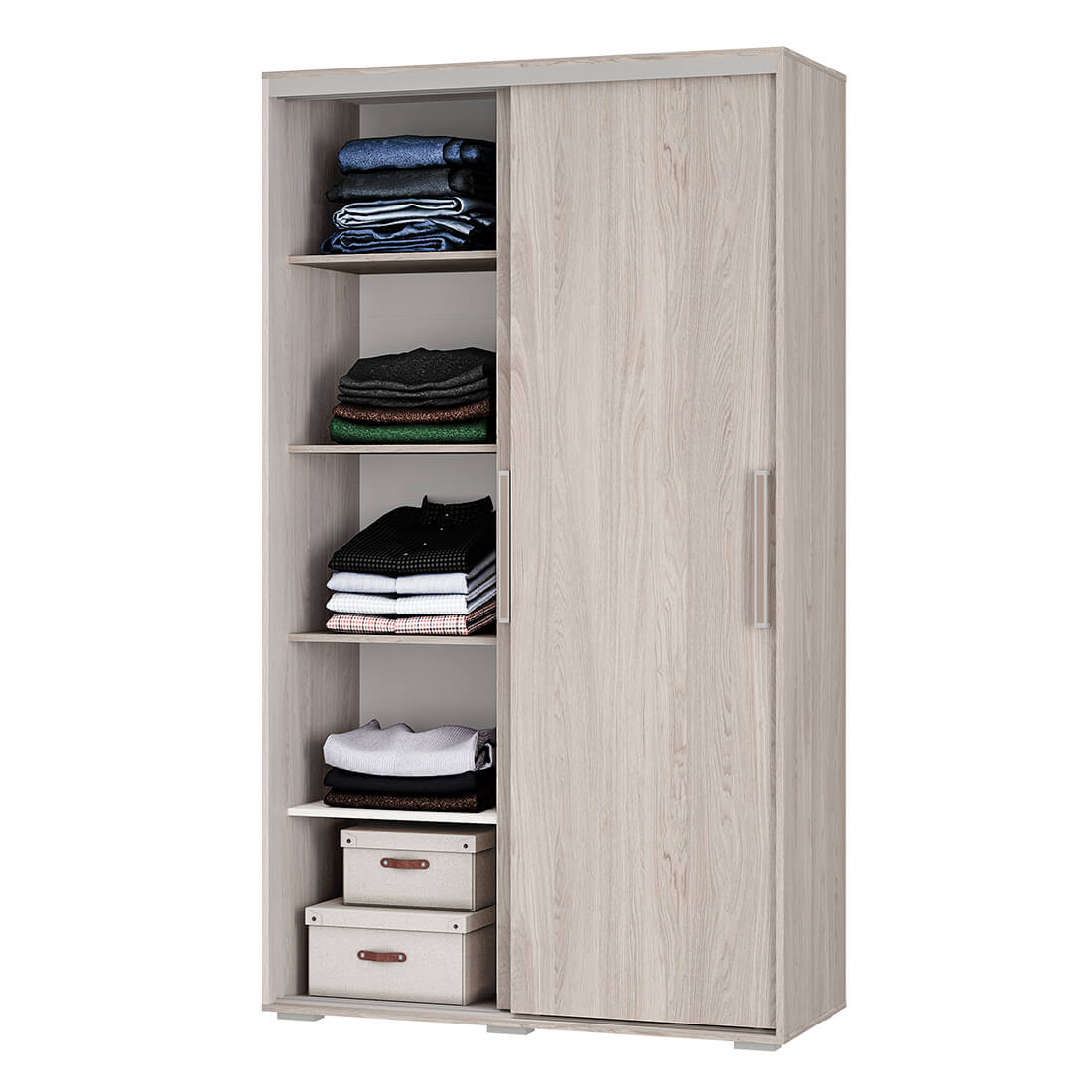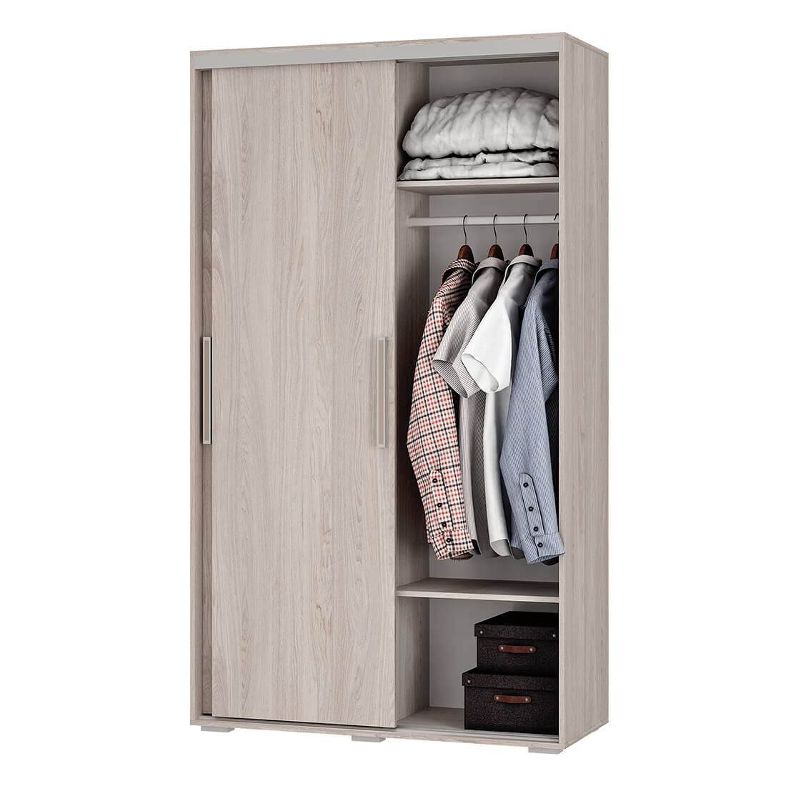 Очень удобный вместительный шкаф-купе представляет собой сочетание функциональности и эстетики. Современный дизайн делает его универсальным и позволяет использовать в самых разных интерьерах. Внутри - пять просторных полок для хранения вещей и антресольная полка для головных уборов, нижняя полка для хранения сезонной обуви и горизонтальная хромированная штанга.