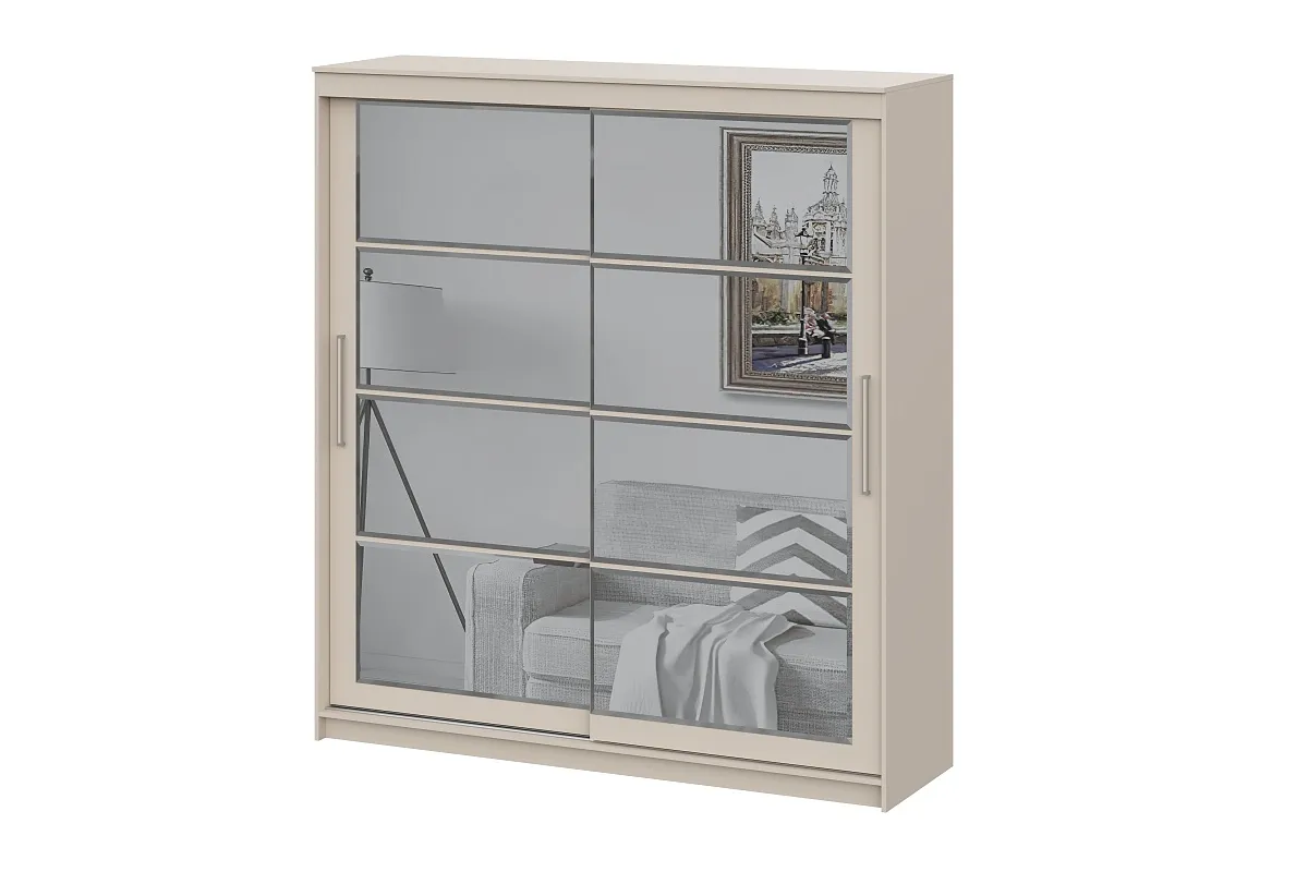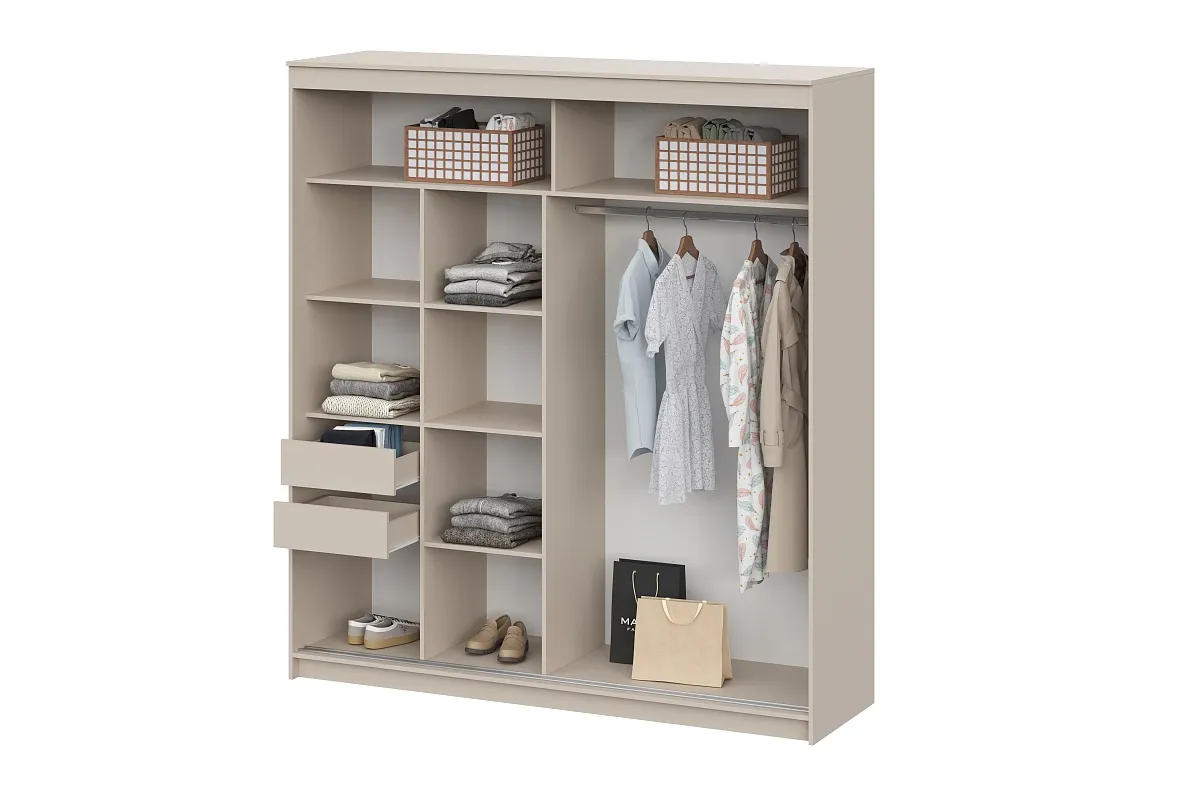 Изделие представляет собой Шкаф с двумя створками купе, левое отделение оснащено полками и двумя выкатными ящиками, правое отделение оснащено штангой для хранение одежды на вешалках. Размер ящиков ШхВхГ 404x100x334 (Нагрузка на ящики max 5кг). Декоративные элементы приклеивается к створкам на производстве. Корпус не универсальный. Створки универсальные. Данное изделие относится к линейке «NN-Мебель». Эта мебель создается на тех же уникальных станках, теми же профессиональными сотрудниками с теми же принципами производства, что и вся мебель на фабрике. Она так же экологична, долговечна и безопасна, а дизайн и функционал нисколько не уступают полюбившимся всем коллекциям бренда «SV-Мебель», от которого ее отличает только гарантия 24 месяца и роликовые направляющие в выдвижных ящиках, что компенсируется максимально доступными ценами на данную линейку.