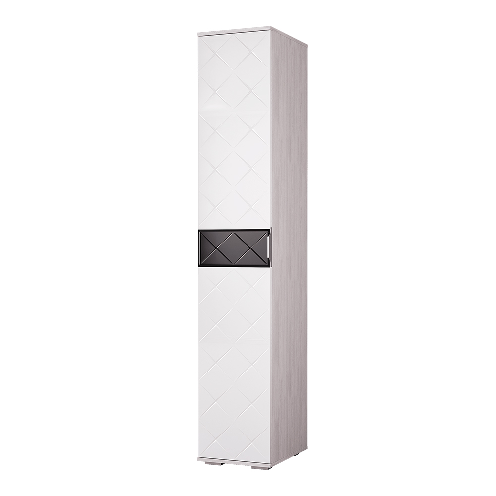 В глубокий пенал "Кимберли" ПН-16 вы сможете повесить свою одежду, на верхней и нижней полке разместить аксессуары и любые принадлежности. Изделие имеет белый глянцевый фасад со вставкой из черного стекла (лакобель) и гравировкой в виде ромбов. Пенал прекрасно подойдет для небольшой комнаты, так как размеры очень компактные.