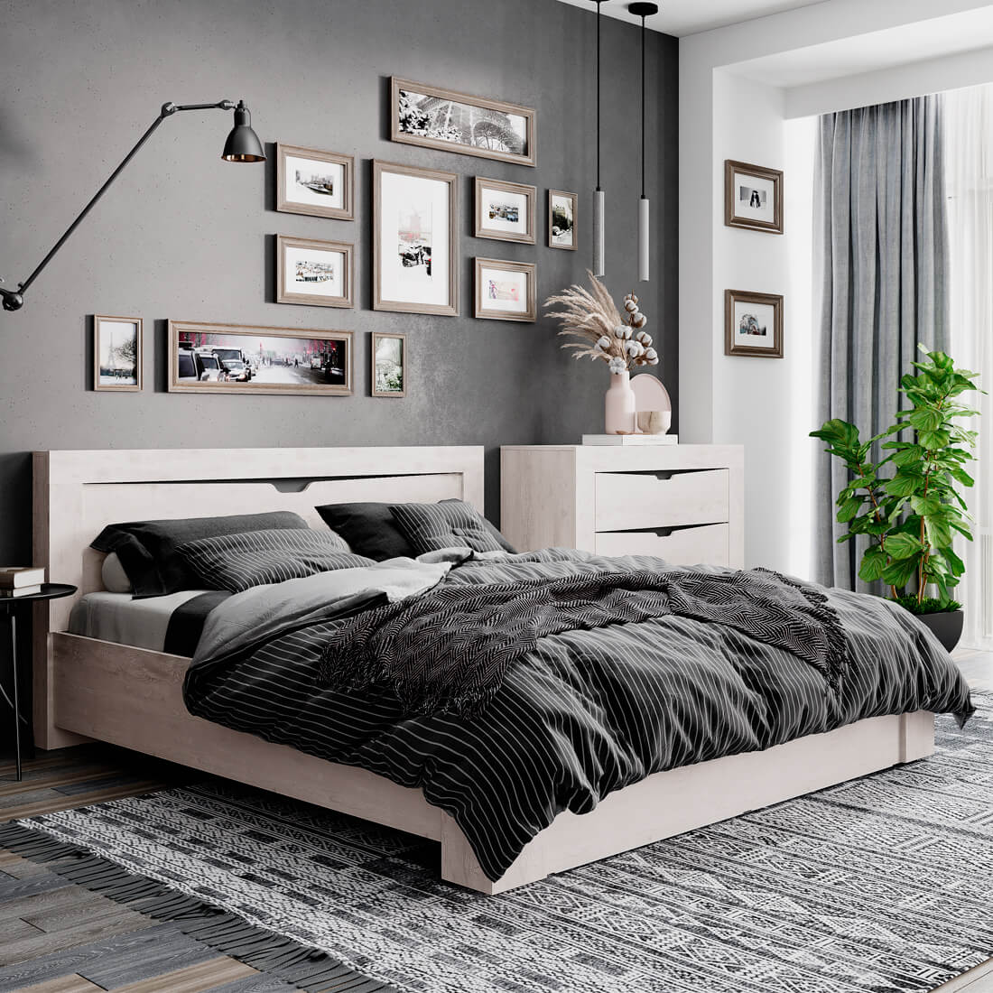 Спальный гарнитур «Леонардо» прекрасно впишется в любой современный интерьер. В комплекте есть всё необходимое для обустройства пространства: широкая кровать и коллекция модулей для хранения одежды, аксессуаров и постельных принадлежностей. Лофтовое цветовое решение корпусов и фасадов – настоящий тренд нашего времени – Бетон пайн светлый. Простой и выразительный, продуманный и небрежный, функциональный и непритязательный – он создаёт атмосферу уличного искусства, а текстура старого дерева добавляет декору индивидуальности.