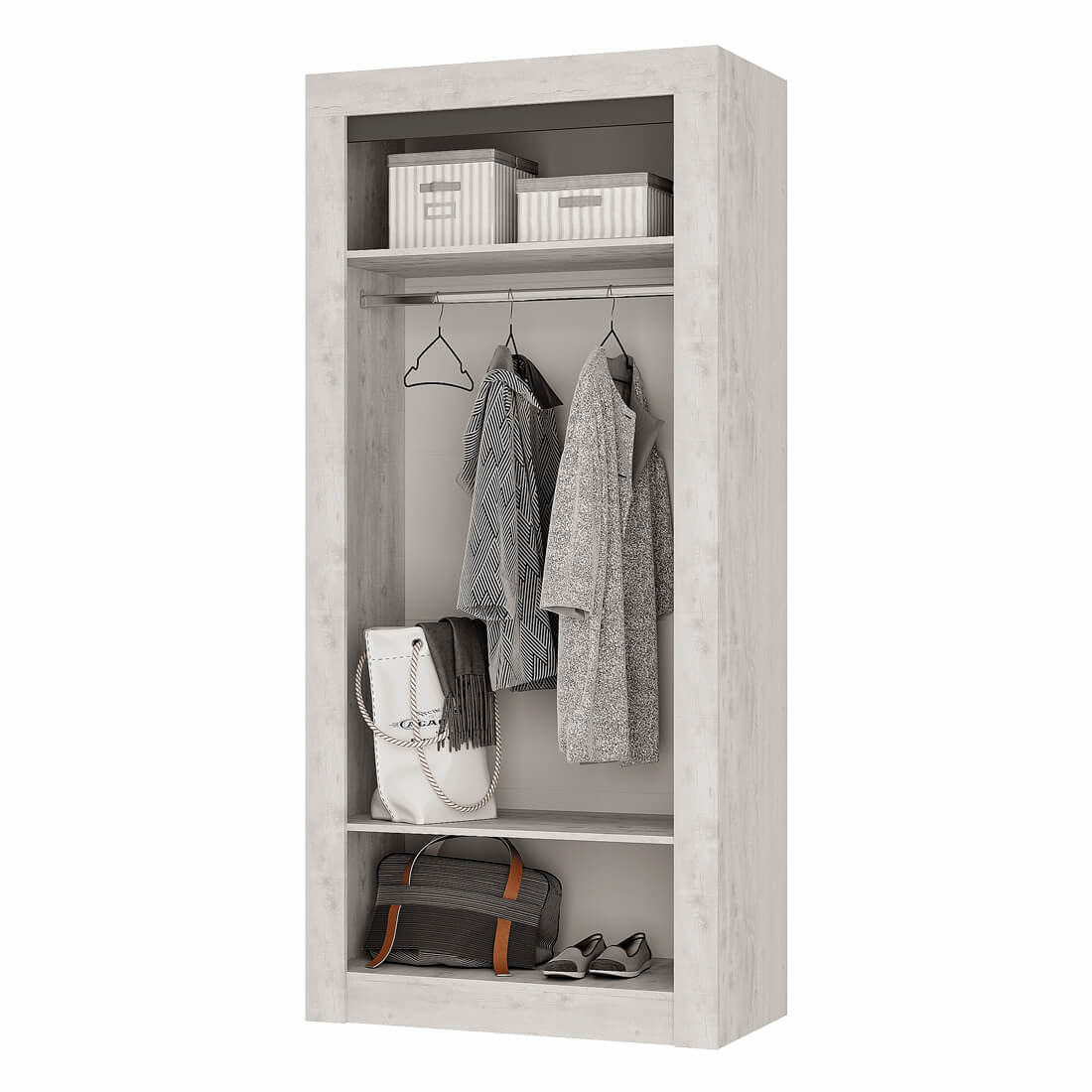 Двустворчатый распашной шкаф «Леонардо» с просторной антресольной полкой для хранения головных уборов, горизонтальной хромированной штангой для плечиков и нижней полкой, в которой удобно хранить коробки с обувью, выдержан в общей стилистики коллекции.
